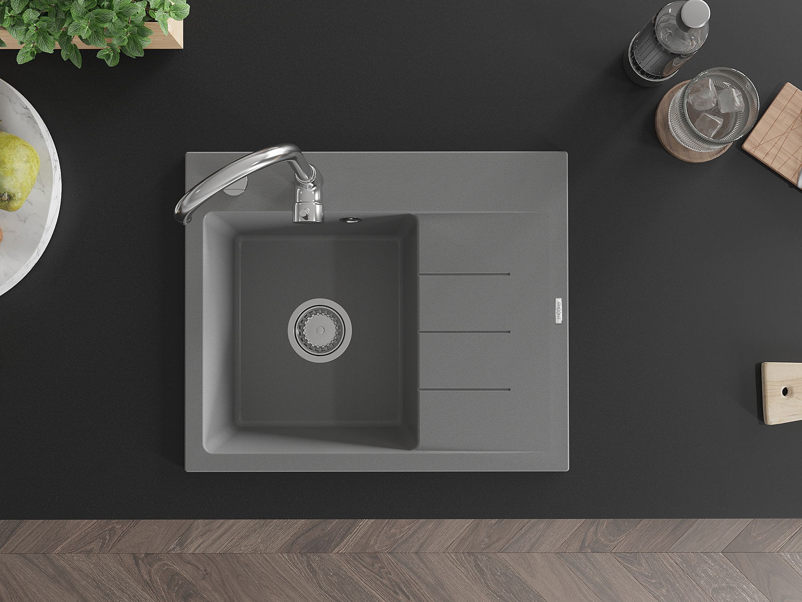 Povrch kuchynského drezu je odolný voči škvrnám a zafarbeniu, vďaka čomu sa ľahko udržiava a zachováva svoju farbu počas dlhého obdobia používania. Estetický a praktický doplnok pre každú kuchyňu.
