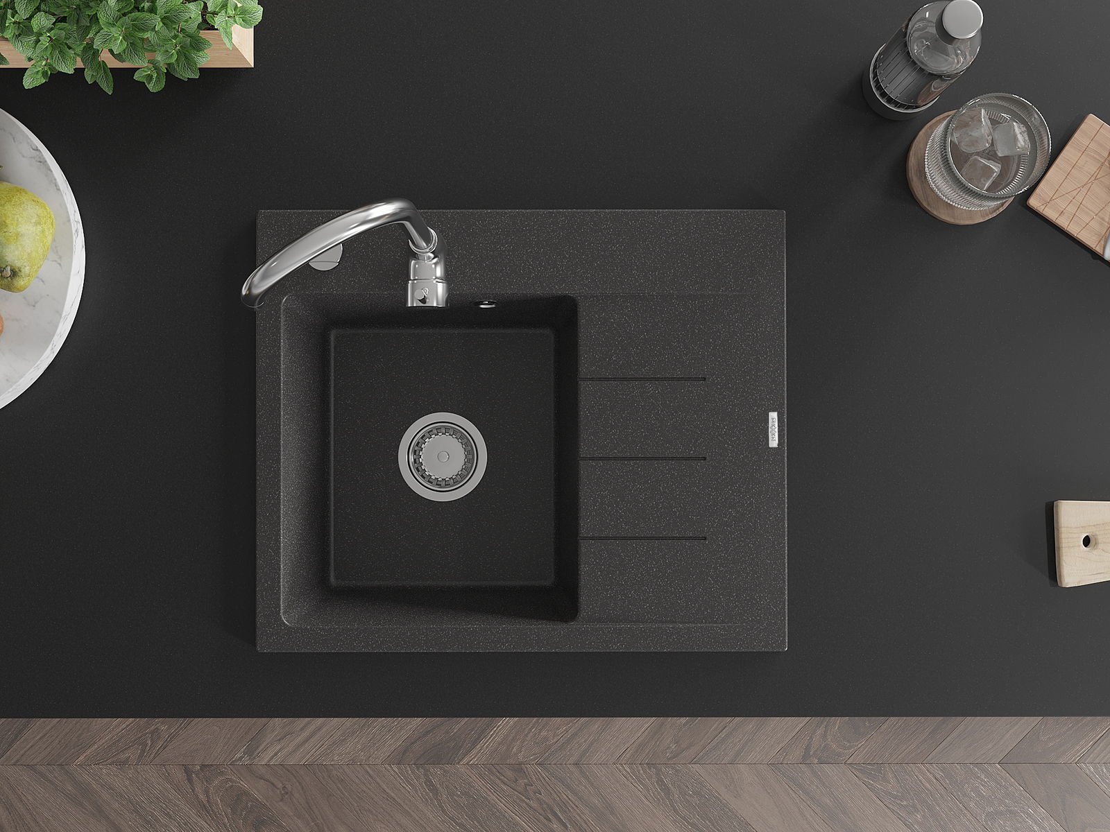 Mexen Ben kamenný drez s 1 komorou s odkvapkávačom, ľavý 600 x 500 mm, čierny s škvrnami, sifón chróm - 6522605000-76