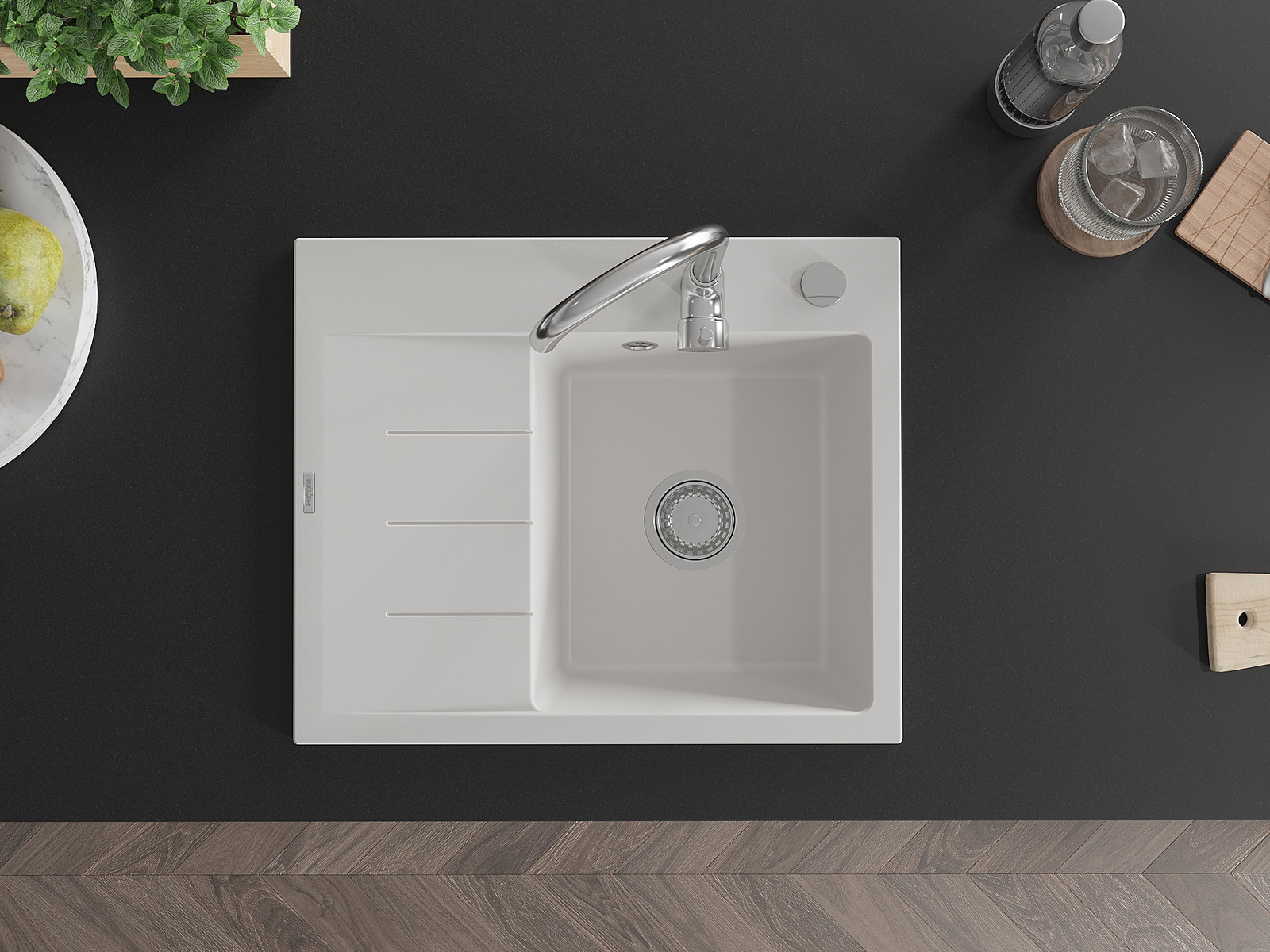 Povrch kuchynského drezu je odolný voči škvrnám a zafarbeniu, vďaka čomu sa ľahko udržiava a zachováva svoju farbu počas dlhého obdobia používania. Estetický a praktický doplnok pre každú kuchyňu.