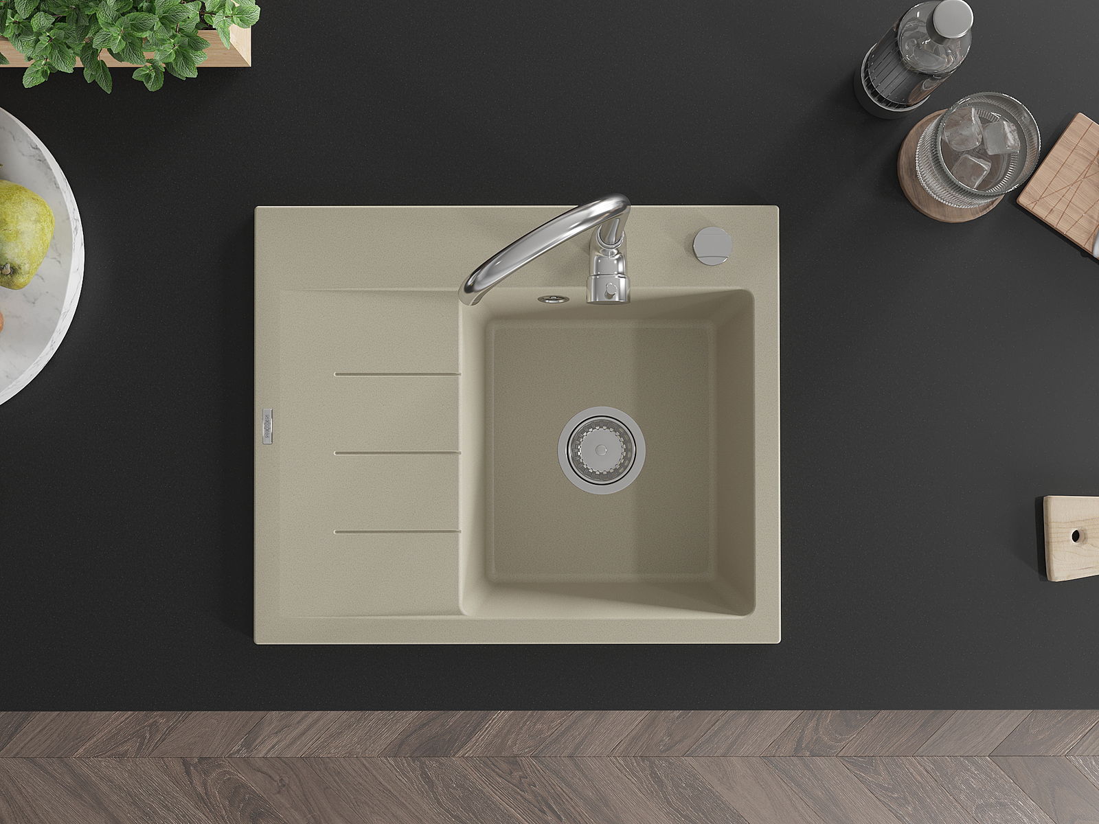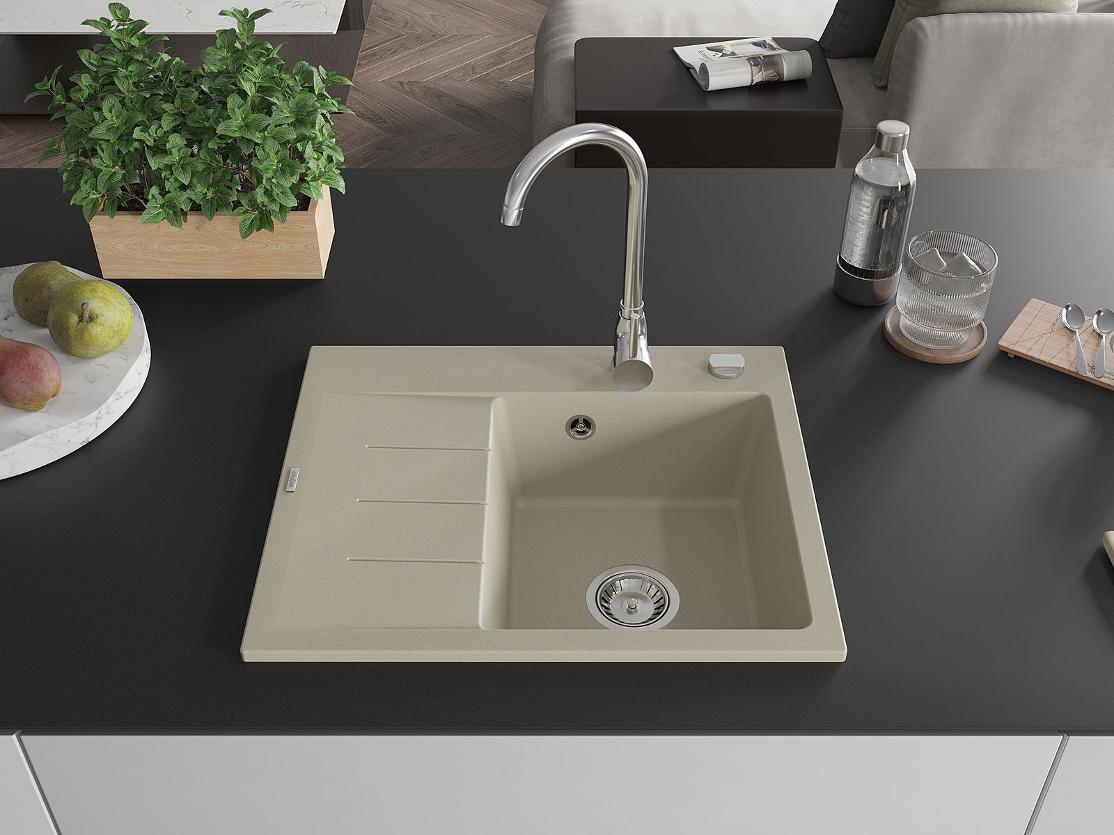 Povrch kuchynského drezu je odolný voči škvrnám a zafarbeniu, vďaka čomu sa ľahko udržiava a zachováva svoju farbu počas dlhého obdobia používania. Estetický a praktický doplnok pre každú kuchyňu.