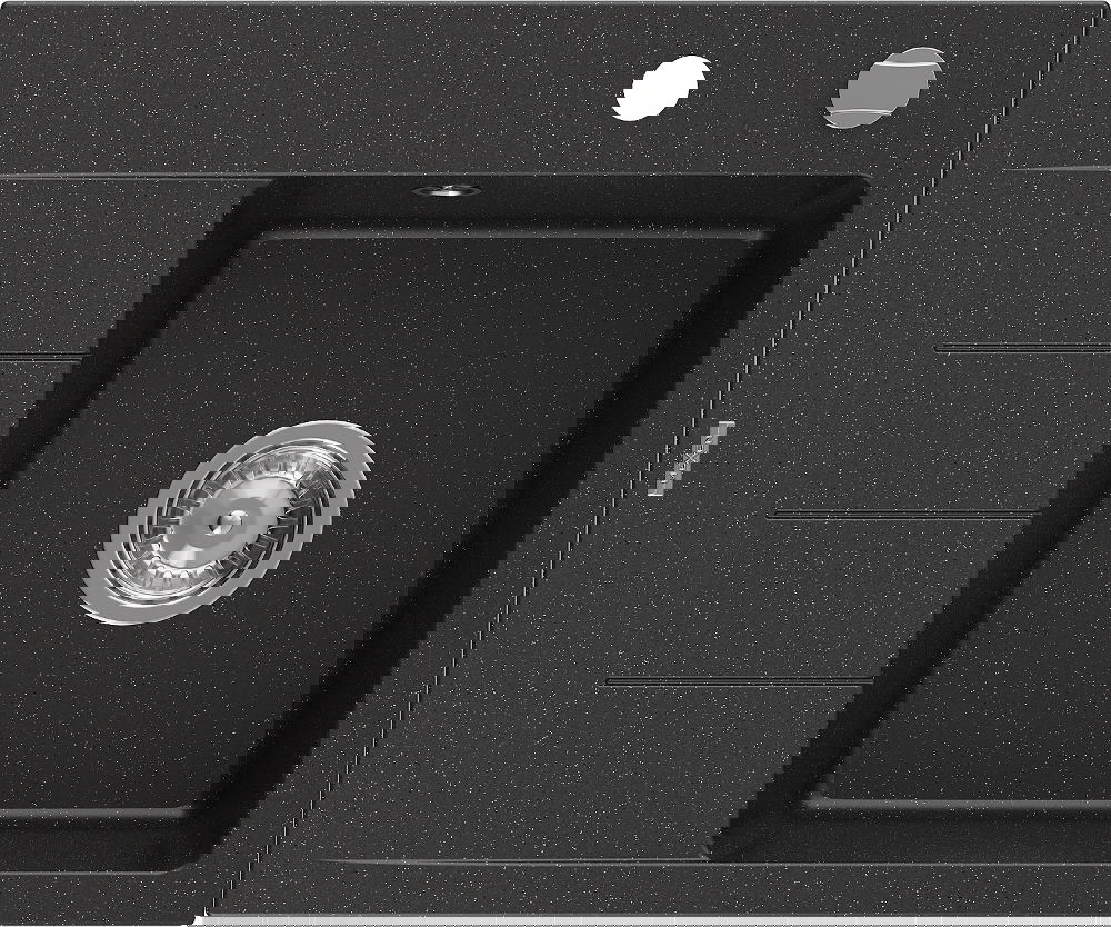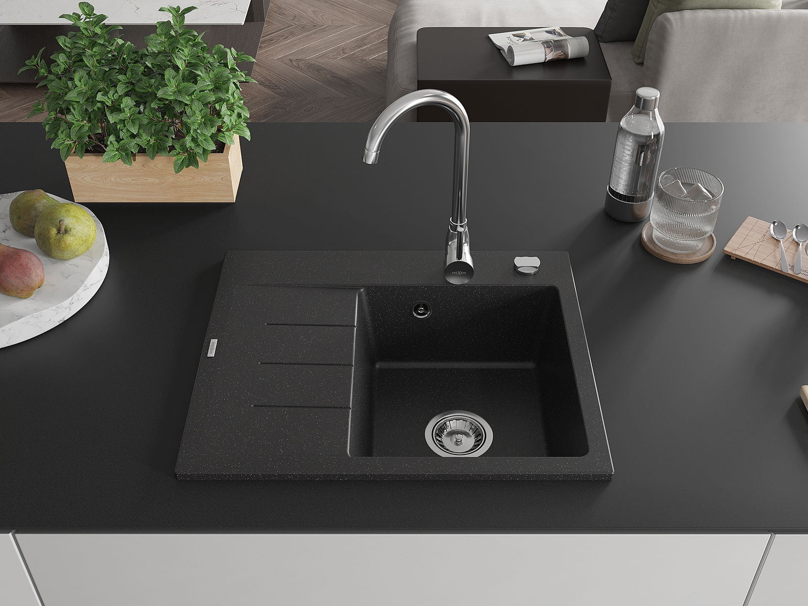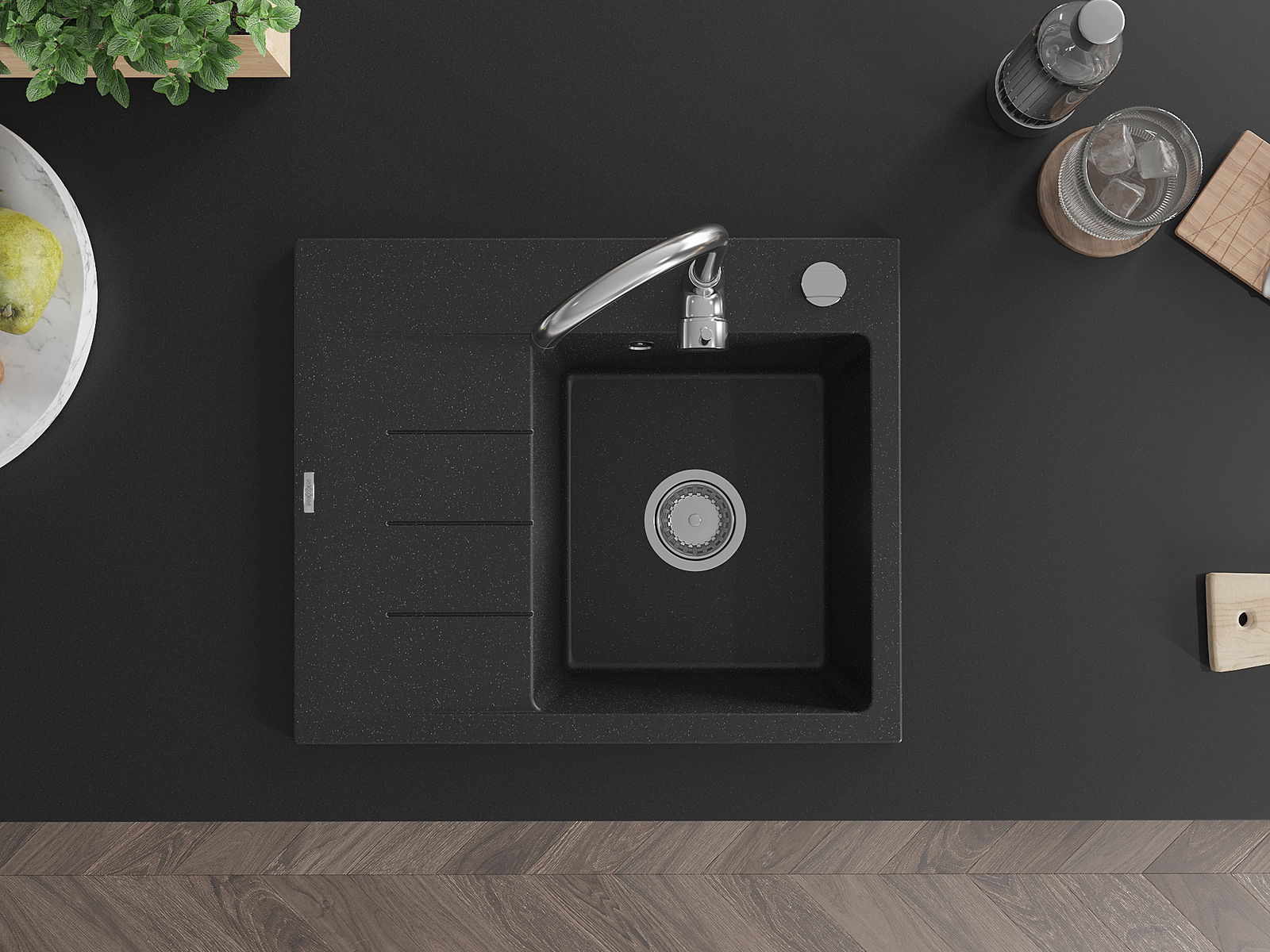 Mexen Ben granitový jednodrez s odkvapkávacou plochou, pravý 600 x 500 mm, čierny/strieborný metalický, chrómový sifón