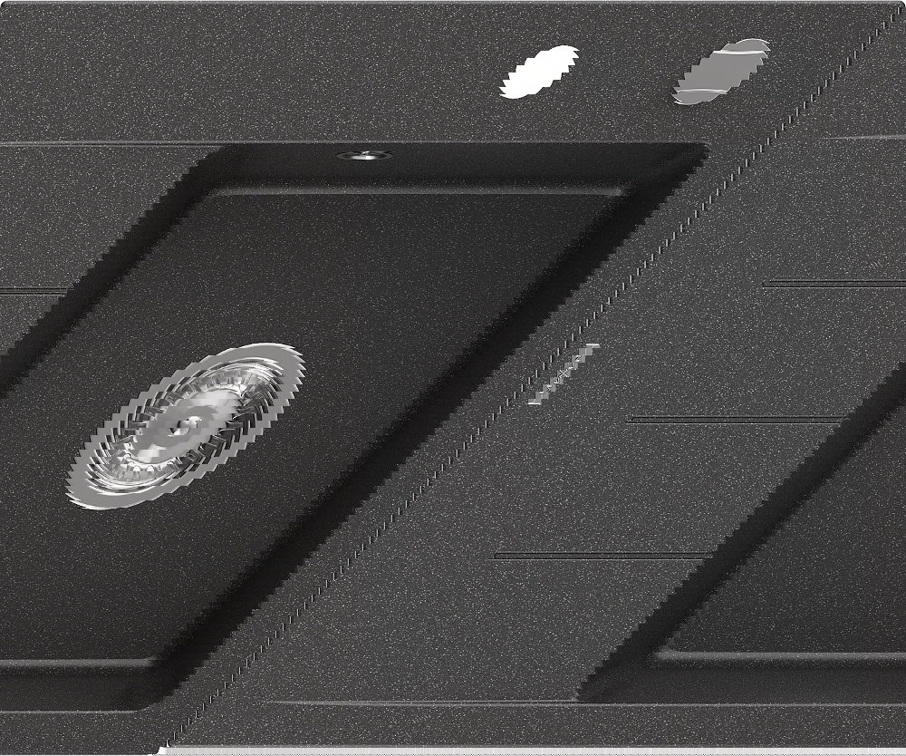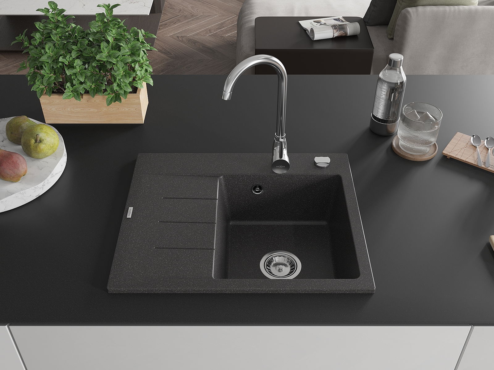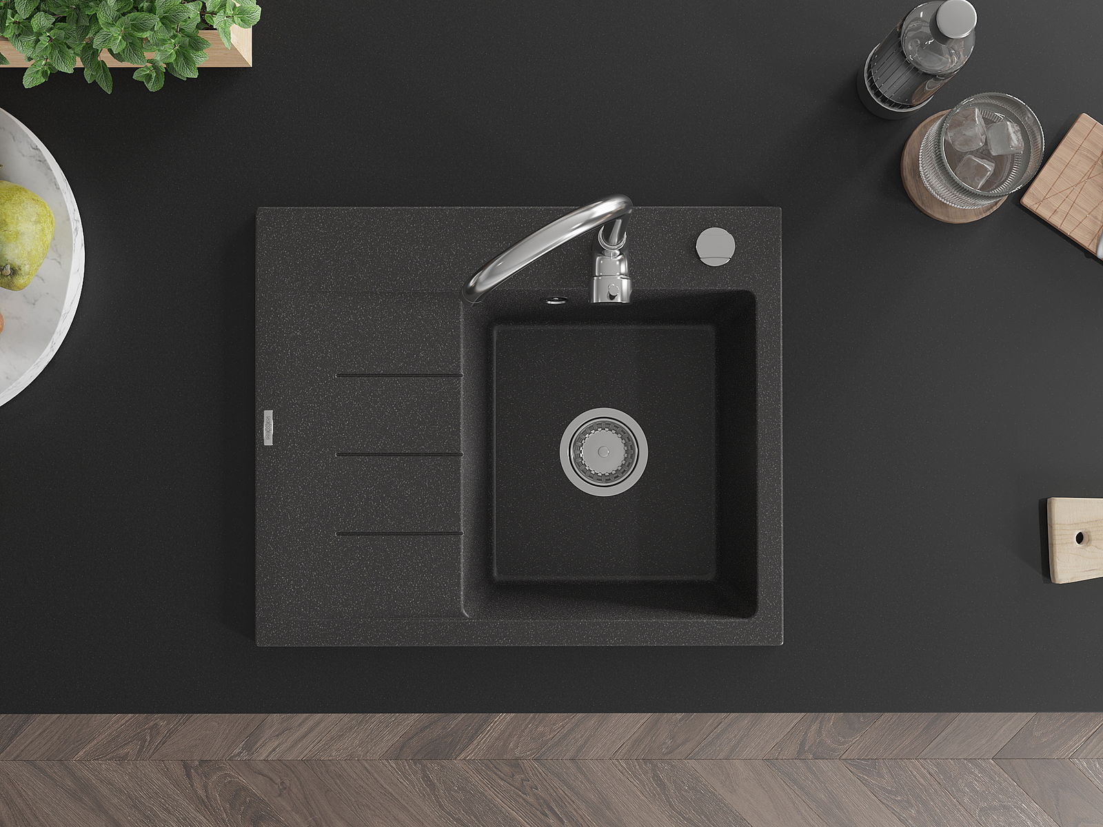 Mexen Ben granitový kuchynský drez 1-komorový s odkvapkávačom, pravý 600 x 500 mm, čierny s bodkami, chrómový sifón