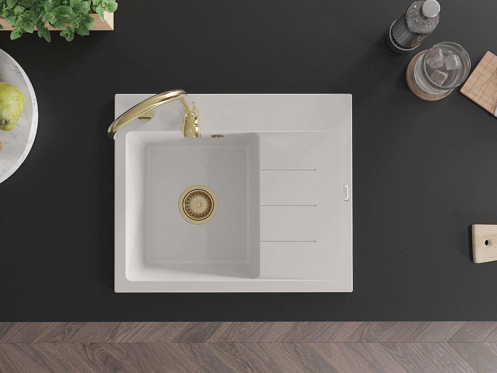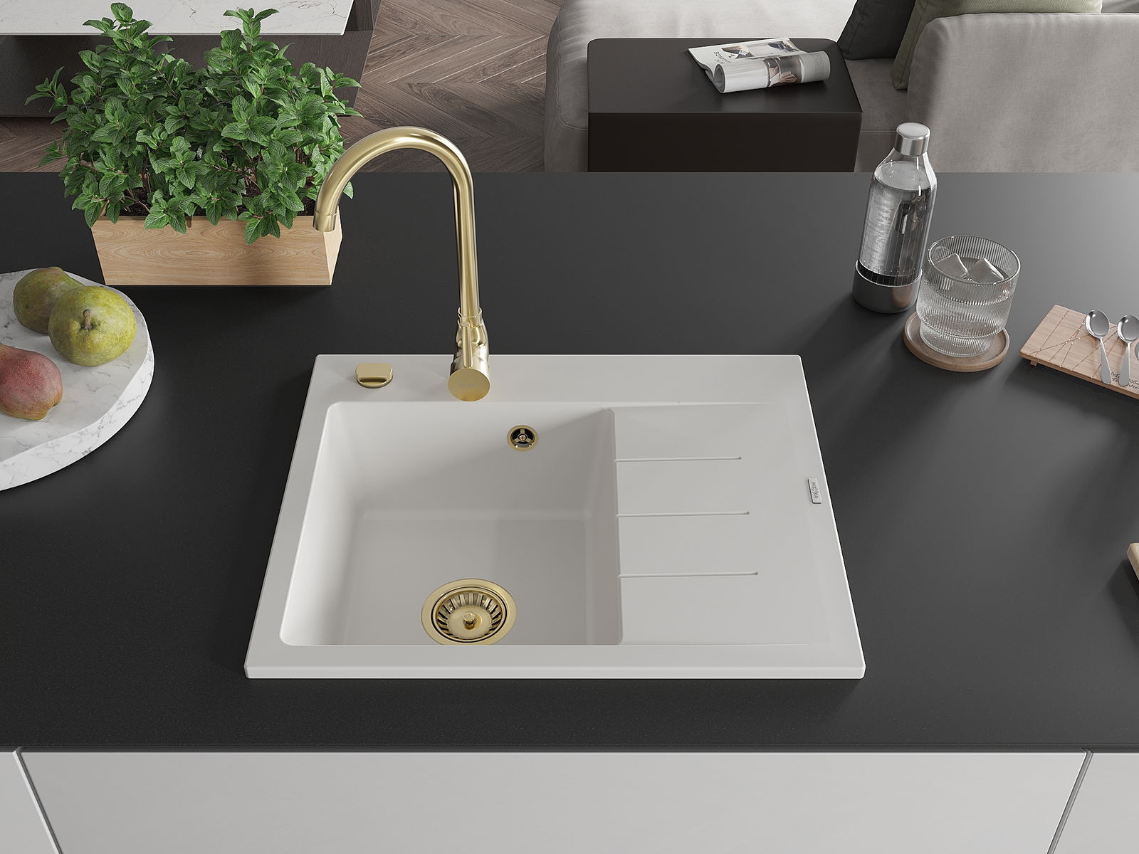 Povrch kuchynského drezu je odolný voči škvrnám a zafarbeniu, vďaka čomu sa ľahko udržiava a zachováva svoju farbu počas dlhého obdobia používania. Estetický a praktický doplnok pre každú kuchyňu.