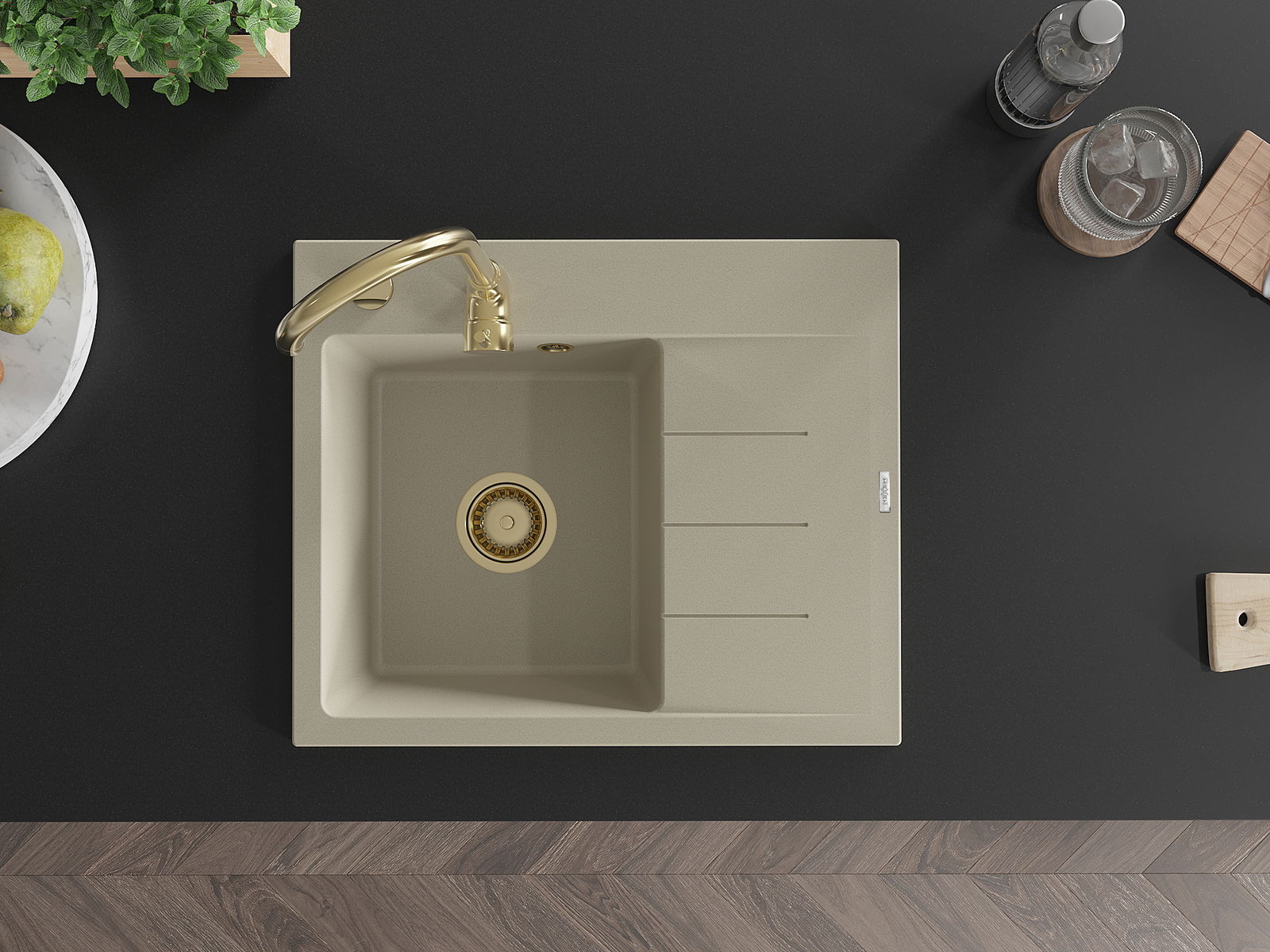 Povrch kuchynského drezu je odolný voči škvrnám a zafarbeniu, vďaka čomu sa ľahko udržiava a zachováva svoju farbu počas dlhého obdobia používania. Estetický a praktický doplnok pre každú kuchyňu.