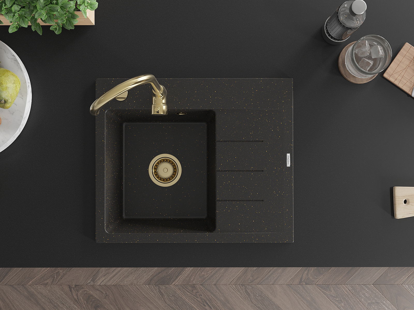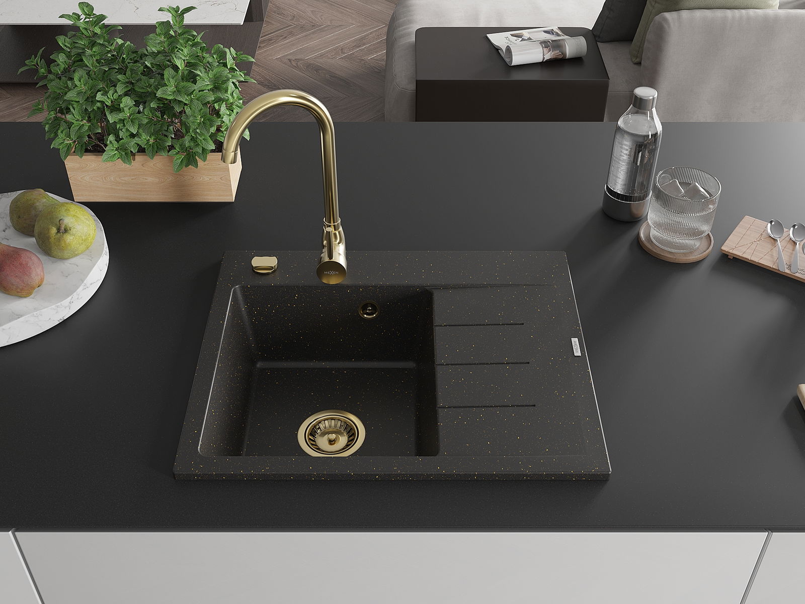 Mexen Ben granitový drez 1-drezový s odkvapkávačom, ľavý 600 x 500 mm, čierny/zlatý metalický, sifón zlatý