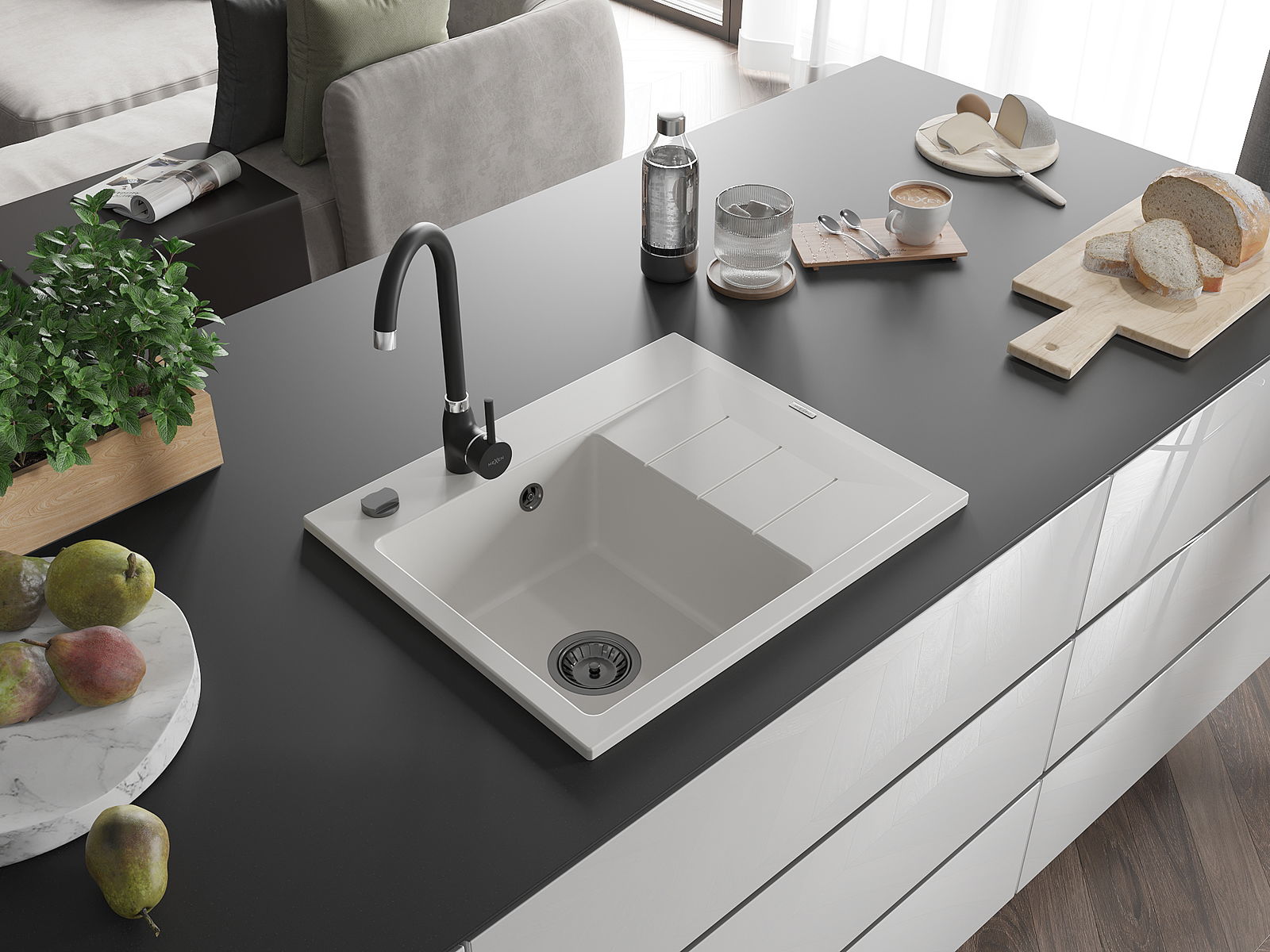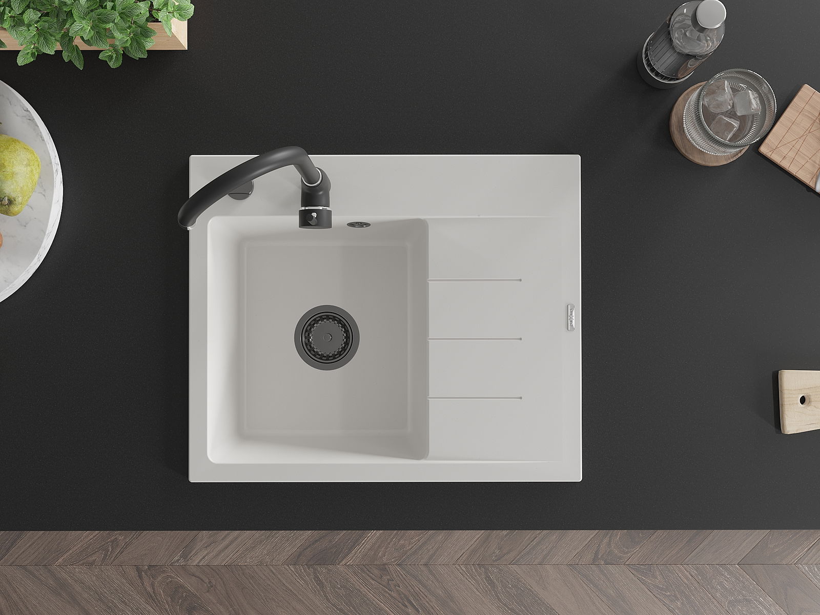 Povrch kuchynského drezu je odolný voči škvrnám a zafarbeniu, vďaka čomu sa ľahko udržiava a zachováva svoju farbu počas dlhého obdobia používania. Estetický a praktický doplnok pre každú kuchyňu.