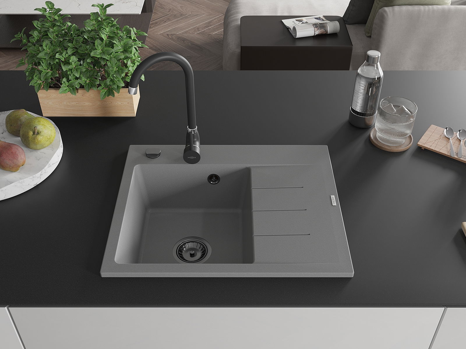 Povrch kuchynského drezu je odolný voči škvrnám a zafarbeniu, vďaka čomu sa ľahko udržiava a zachováva svoju farbu počas dlhého obdobia používania. Estetický a praktický doplnok pre každú kuchyňu.