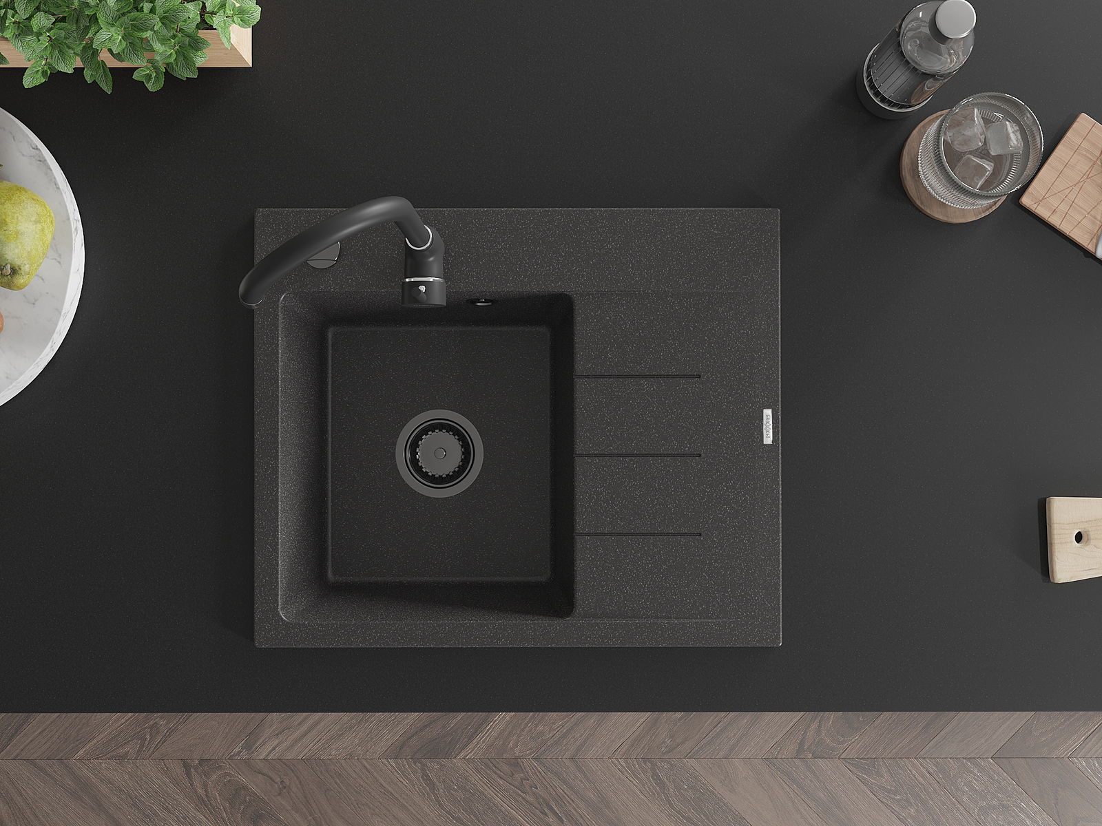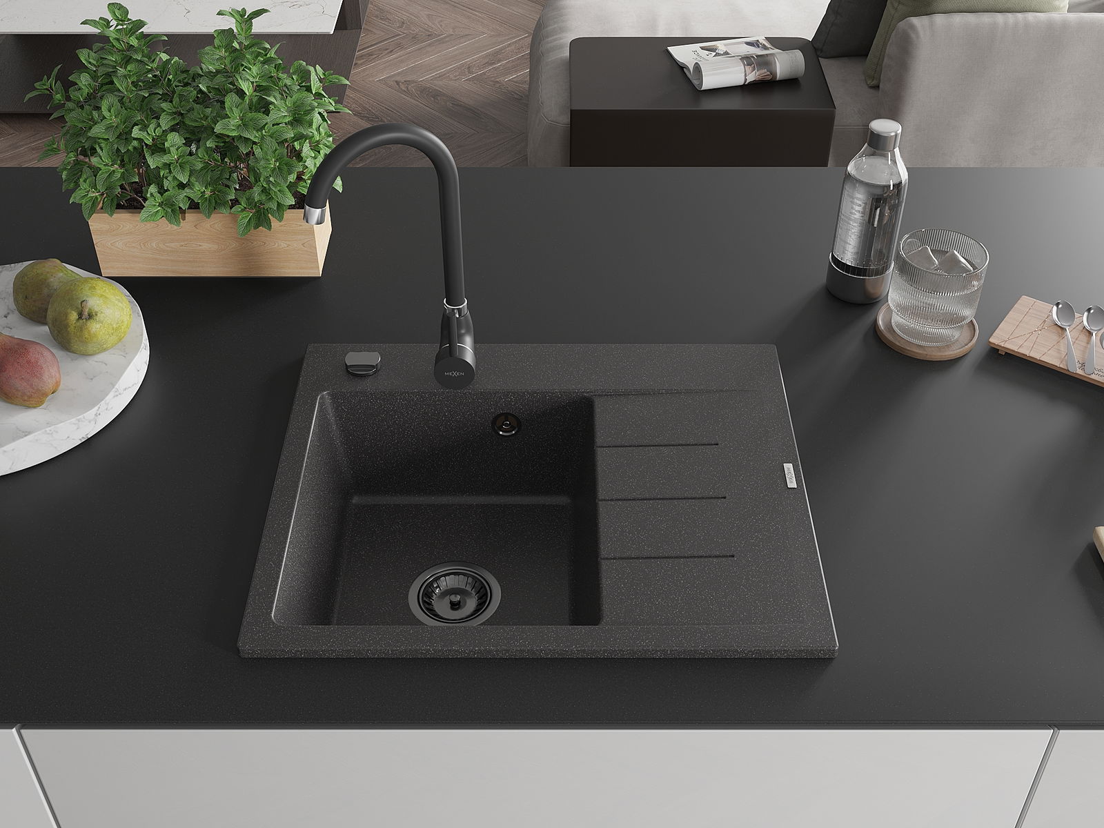 Mexen Ben granitový drez s 1 komorou a odkvapkávačom, ľavý 600 x 500 mm, čierny bodkovaný, čierny sifón