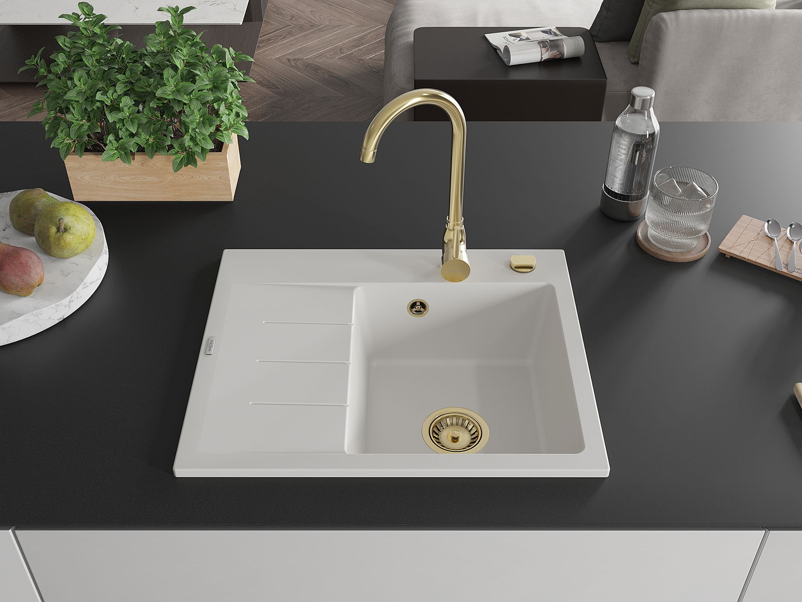 Povrch kuchynského drezu je odolný voči škvrnám a zafarbeniu, vďaka čomu sa ľahko udržiava a zachováva svoju farbu počas dlhého obdobia používania. Estetický a praktický doplnok pre každú kuchyňu.