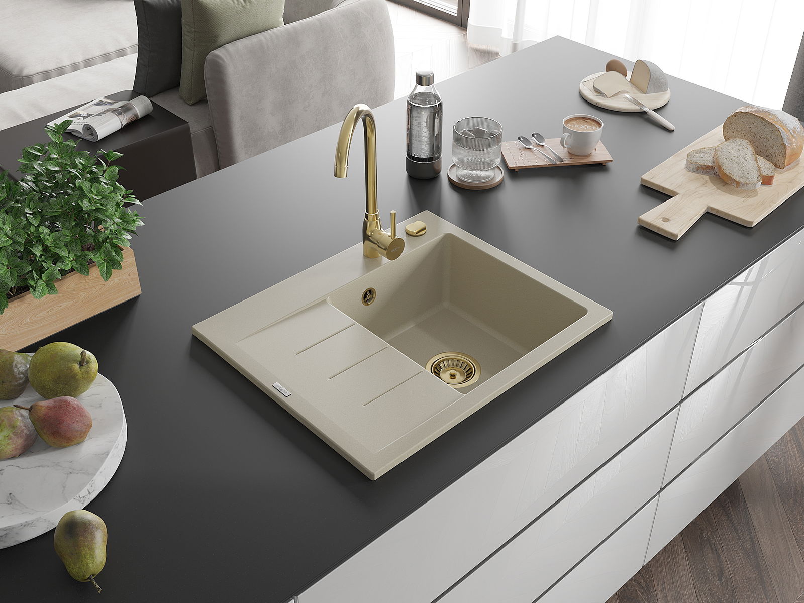 Drez má predfrézovaný otvor s priemerom 35 mm na samostatné prerazenie. Môže sa využiť napríklad na montáž dávkovača na tekutinu, ktorý eliminuje prítomnosť plastových fliaš v kuchyni a pridáva jej elegantné dokončenie.