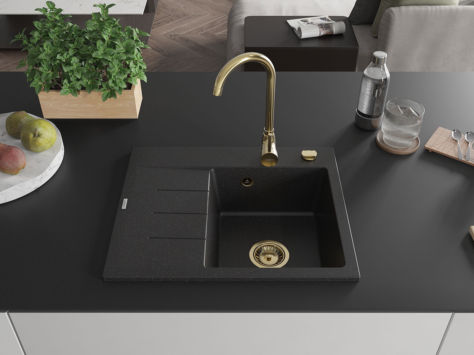 Mexen Ben granitový drez s 1 komorou a odkvapkávačom, pravý 600 x 500 mm čierny/strieborný metalik sifón zlatý