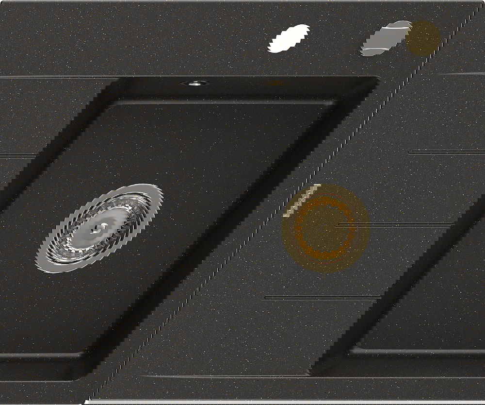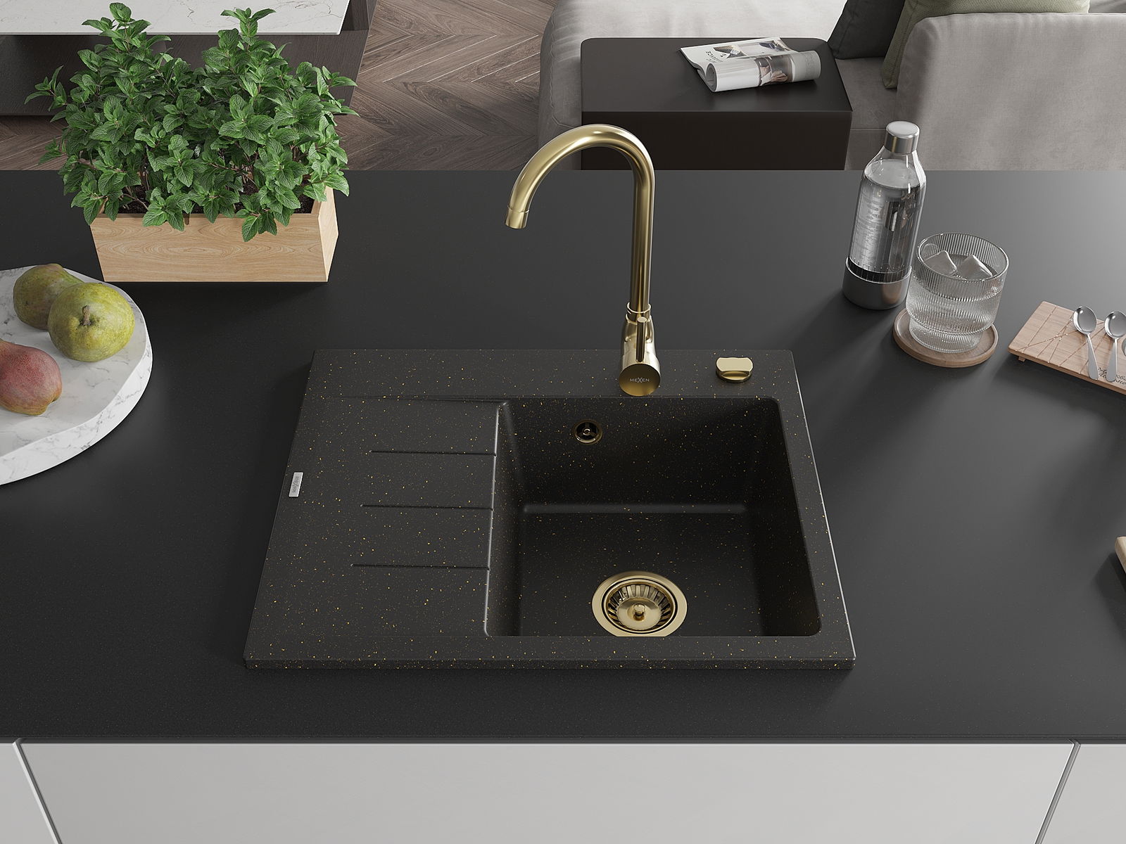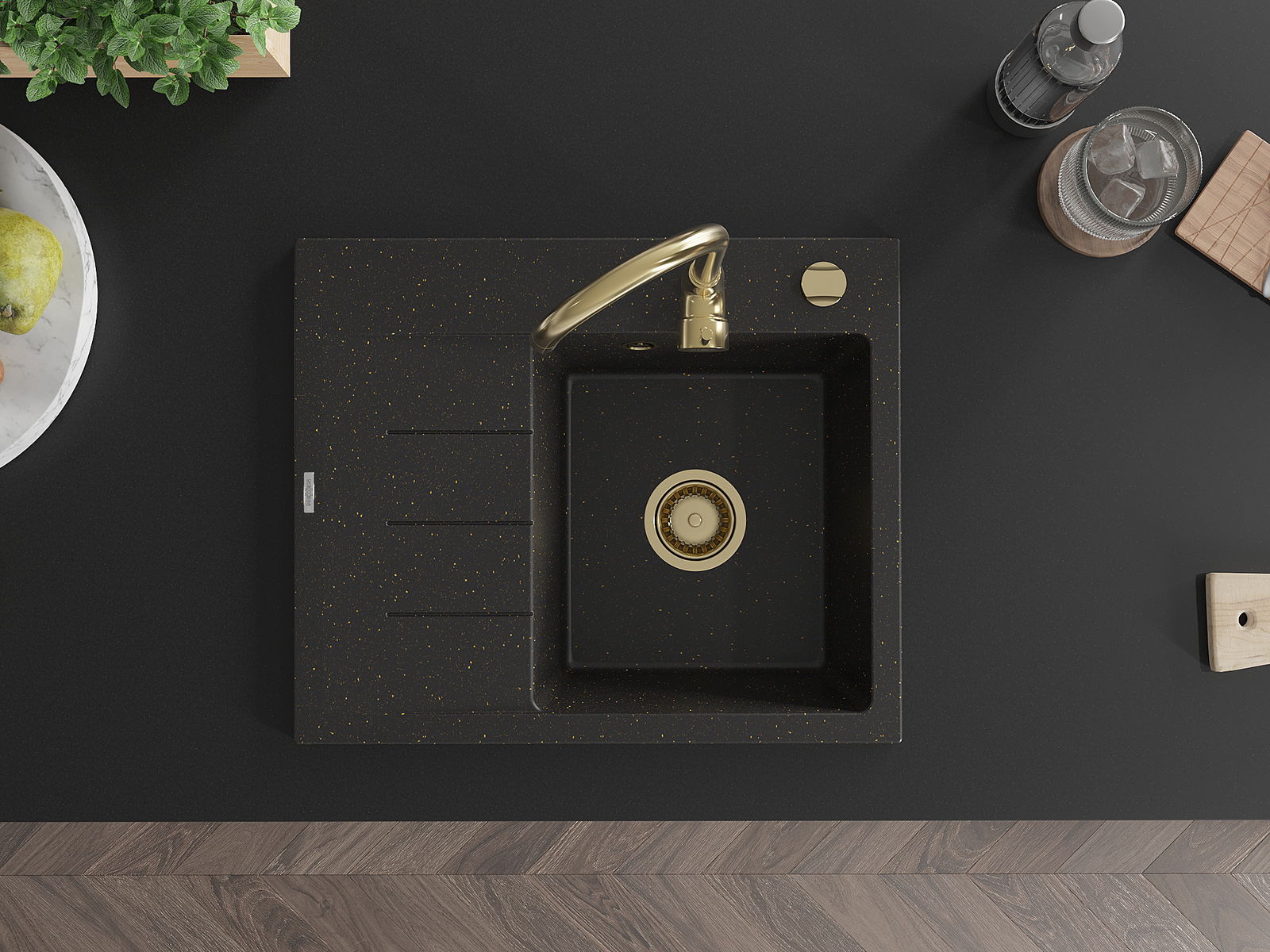 Mexen Ben granitový kuchynský drez s 1 komorou a odkvapkávačom, pravý 600 x 500 mm, čierny/zlatý metalický, sifón