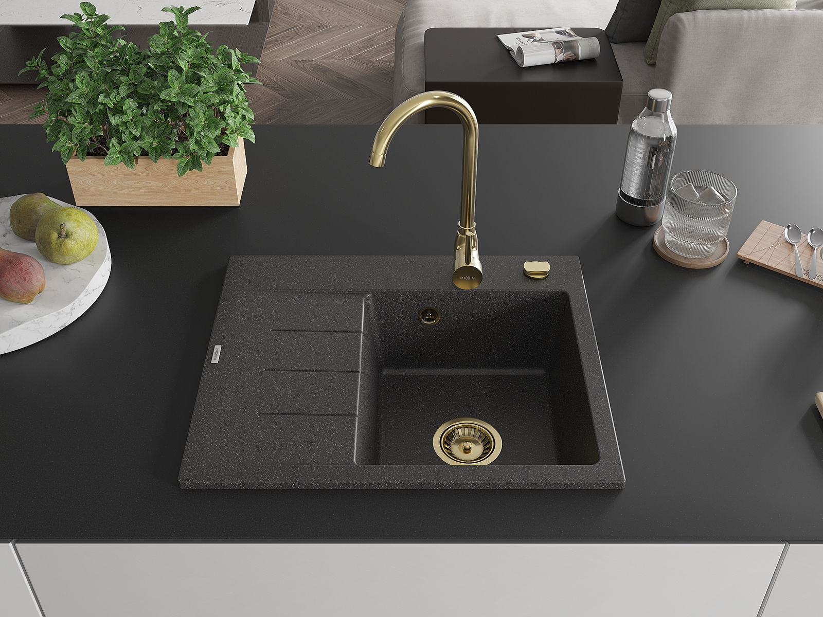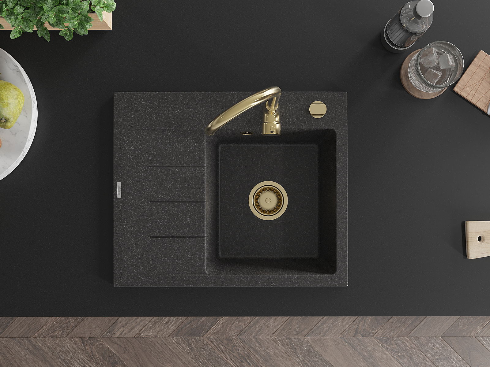 Mexen Ben Granitový drez s 1 komorou a odkvapkávačom, pravý 600 x 500 mm, čierny s fľakmi, zlatý sifón - 6523605000-76-G