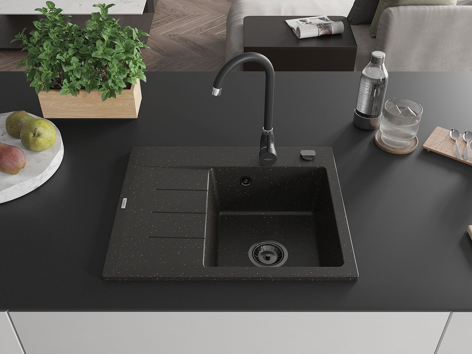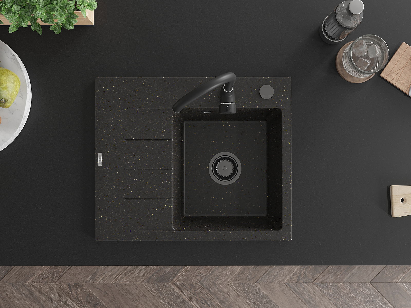 Mexen Ben Granitový drez s 1 komorou a odkvapkávačom, pravý 600 x 500 mm, čierny/zlatý metalik s čiernym sifónom