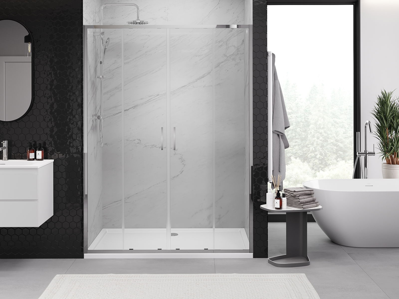 Posuvné dvere sa pohybujú po špeciálnych koľajniciach a nevyžadujú dodatočný priestor na otvorenie, preto sú ideálne pre menšie kúpeľne. Vďaka dvojitým kolieskam s kovovým telom je ich pohyb plynulý.