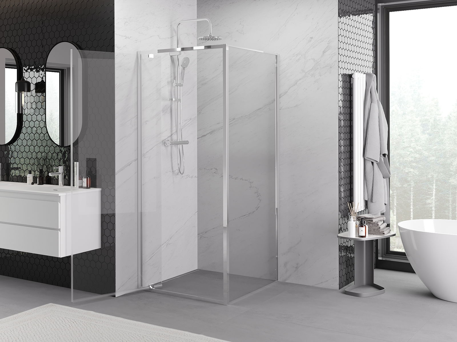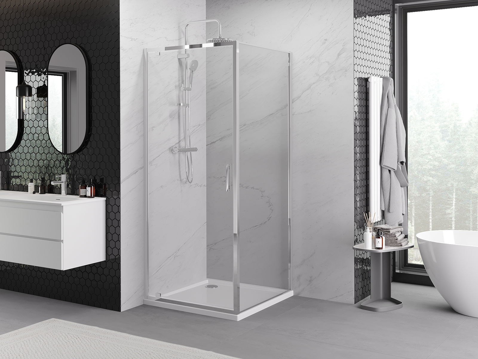 Produkt je možné podľa potreby namontovať ako na sprchovej vaničke, tak aj priamo na podlahe. Univerzálny spôsob montáže umožňuje prispôsobiť produkt rôznym typom kúpeľní a konfiguráciám priestoru.