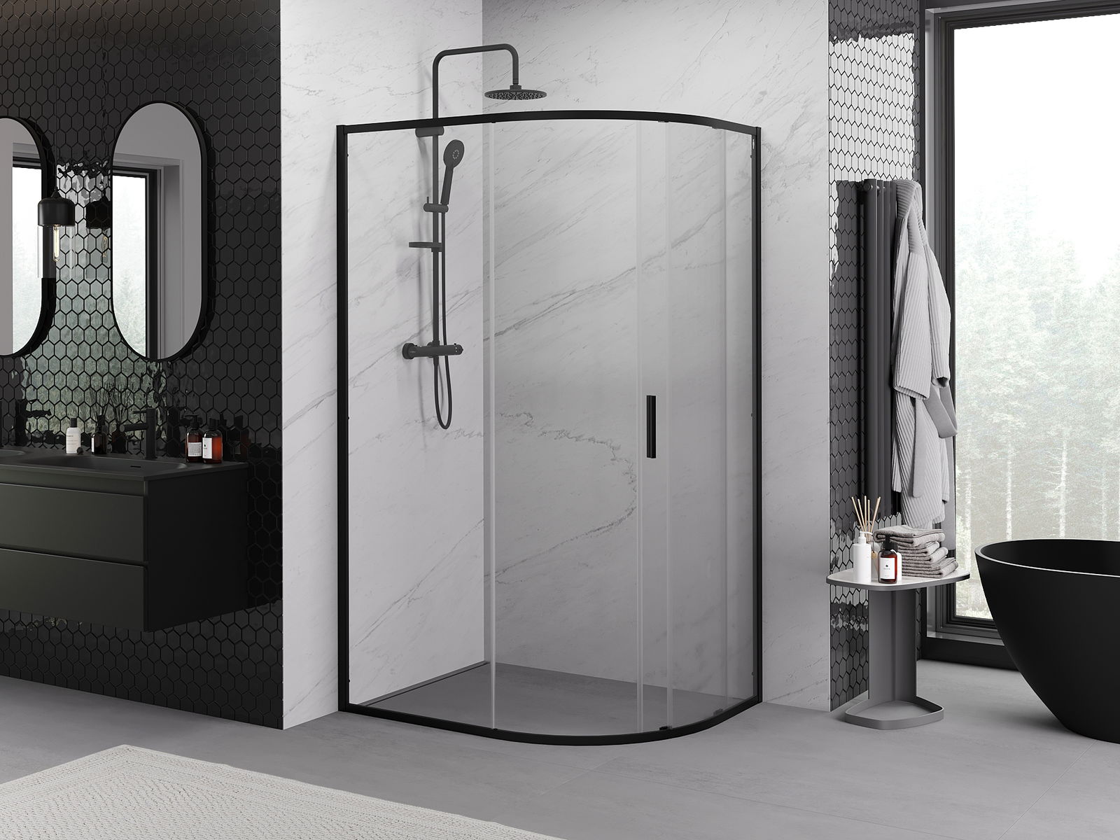 Praktická a pohodlná rukoväť je vyrobená z odolného a pevného kovu. Moderný tvar v kombinácii s povrchovou úpravou prispôsobenou farbe profilov dodáva celku moderný a štýlový vzhľad, zdôrazňujúc estetiku každej kúpeľne.