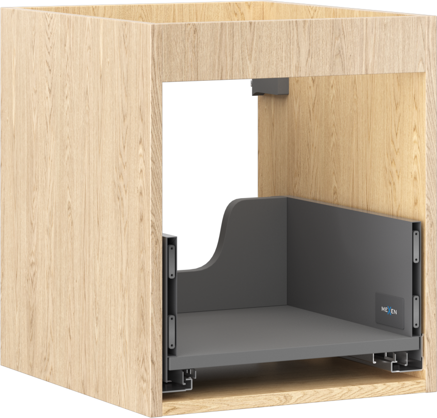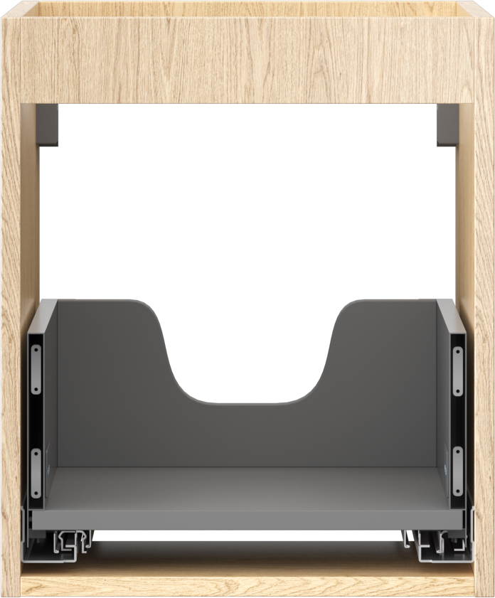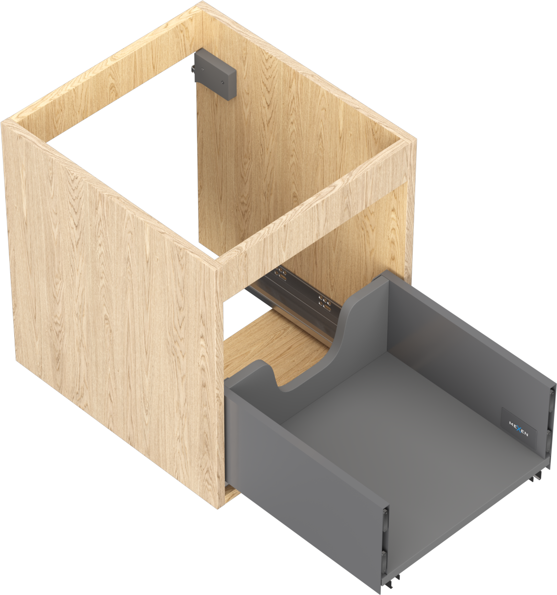 Výrez v zásuvke je navrhnutý tak, aby pojal sifón, ktorý je nevyhnutný v umývadlových inštaláciách. Vďaka tomu môže byť nábytok namontovaný plne funkčne, bez nutnosti vzdávať sa priestoru v zásuvke v prospech inštalácie.