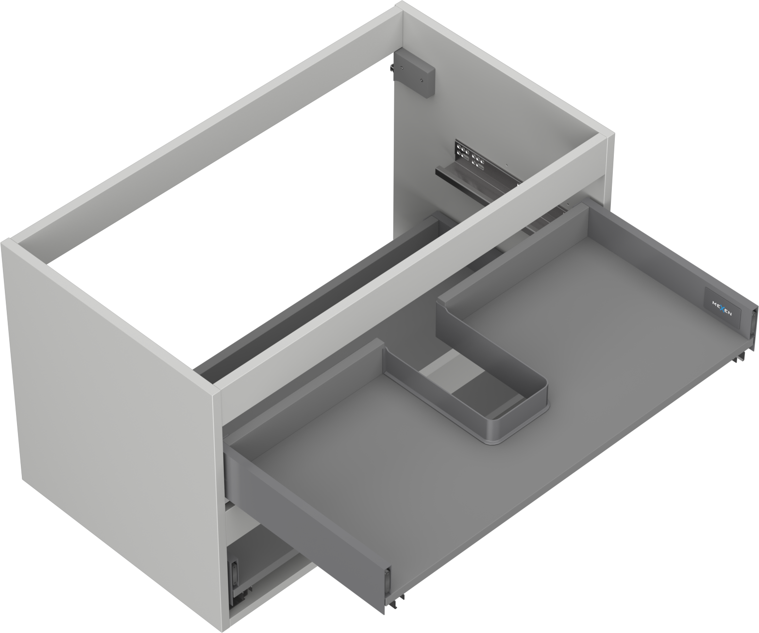 Výrez v zásuvke je navrhnutý tak, aby pojal sifón, ktorý je nevyhnutný v umývadlových inštaláciách. Vďaka tomu môže byť nábytok namontovaný plne funkčne, bez nutnosti vzdávať sa priestoru v zásuvke v prospech inštalácie.