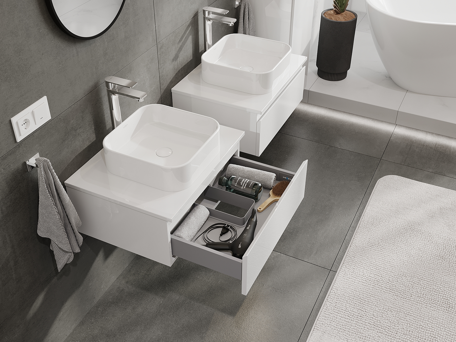 Výrez v zásuvke je navrhnutý tak, aby pojal sifón, ktorý je nevyhnutný v umývadlových inštaláciách. Vďaka tomu môže byť nábytok namontovaný plne funkčne, bez nutnosti vzdávať sa priestoru v zásuvke v prospech inštalácie.
