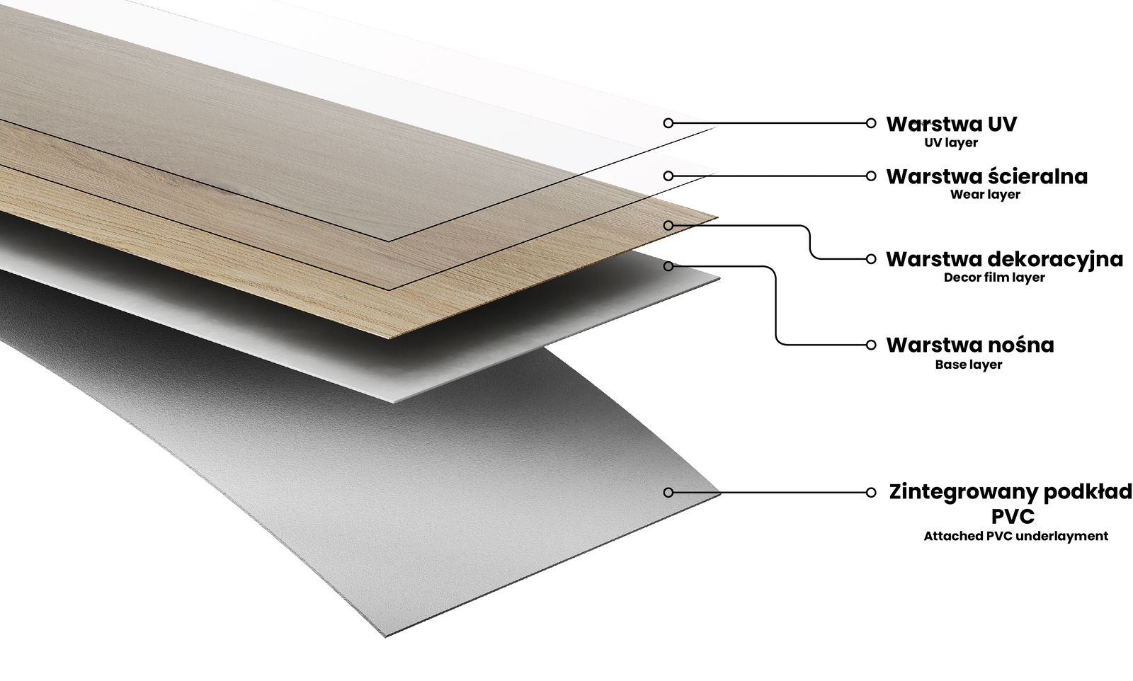 Pri ukladaní vinylových panelov je potrebné pamätať na použitie podkladu, ktorý plní funkciu tepelnej a akustickej izolácie, a taktiež zabezpečuje stabilitu podlahy. Náš produkt má integrovaný podklad - vďaka tomuto riešeniu nemusíme na podlahe rozkladať dodatočné materiály a položenie podlahy je oveľa pohodlnejšie a rýchlejšie.