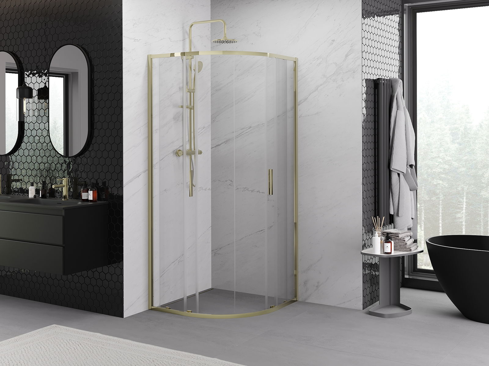 Mexen Exo, polkruhový sprchovací kút 90 x 90 cm, priehľadný, zlatý - 8132-090-090-50-00
