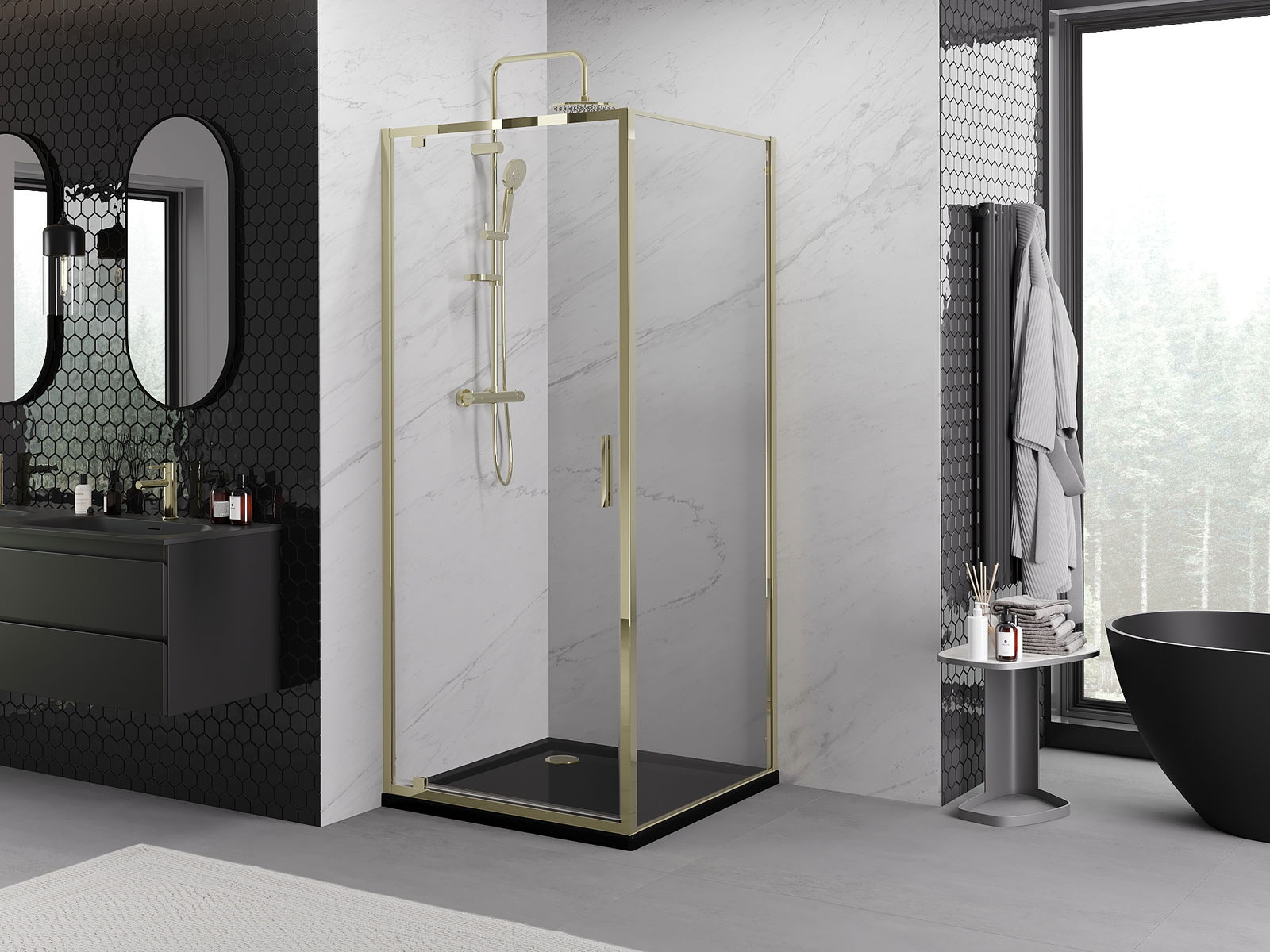 Praktická a pohodlná rukoväť je vyrobená z odolného a pevného kovu. Moderný tvar v kombinácii s povrchovou úpravou prispôsobenou farbe profilov dodáva celku moderný a štýlový vzhľad, zdôrazňujúc estetiku každej kúpeľne.