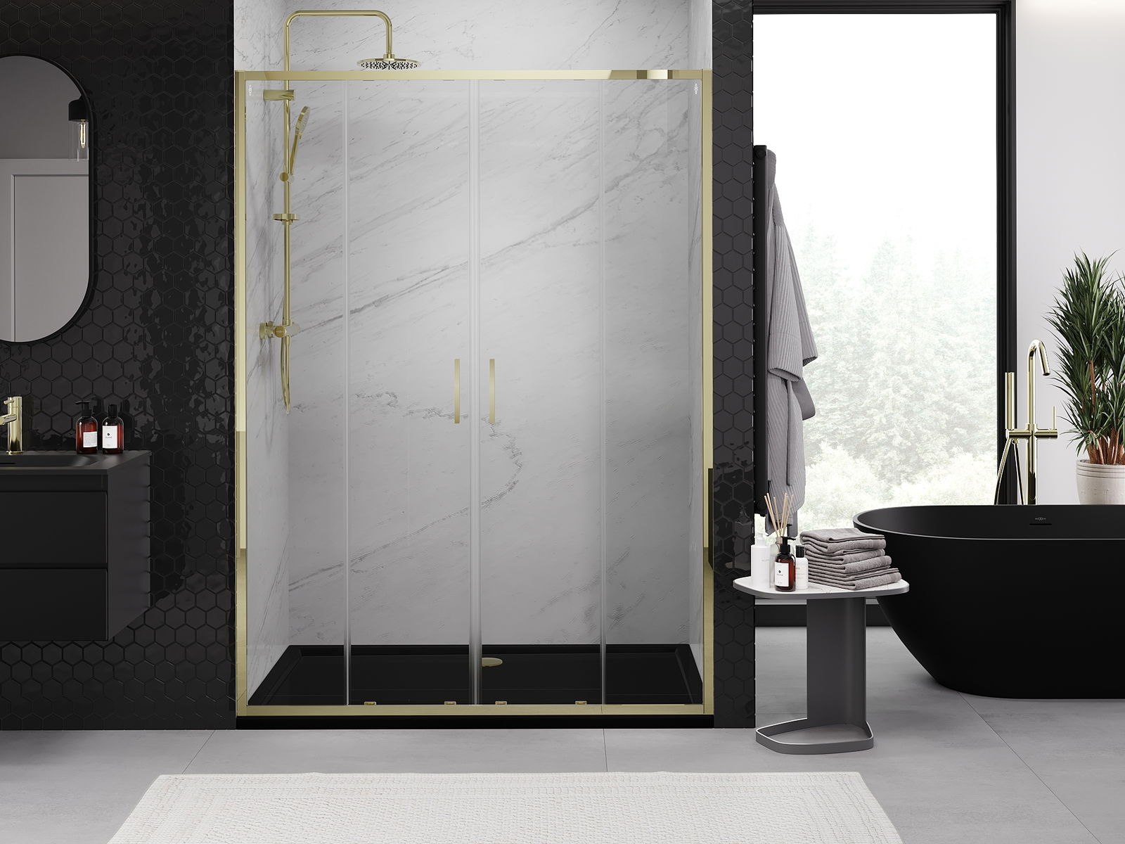 Posuvné dvere sa pohybujú po špeciálnych koľajniciach a nevyžadujú dodatočný priestor na otvorenie, preto sú ideálne pre menšie kúpeľne. Vďaka dvojitým kolieskam s kovovým telom je ich pohyb plynulý.