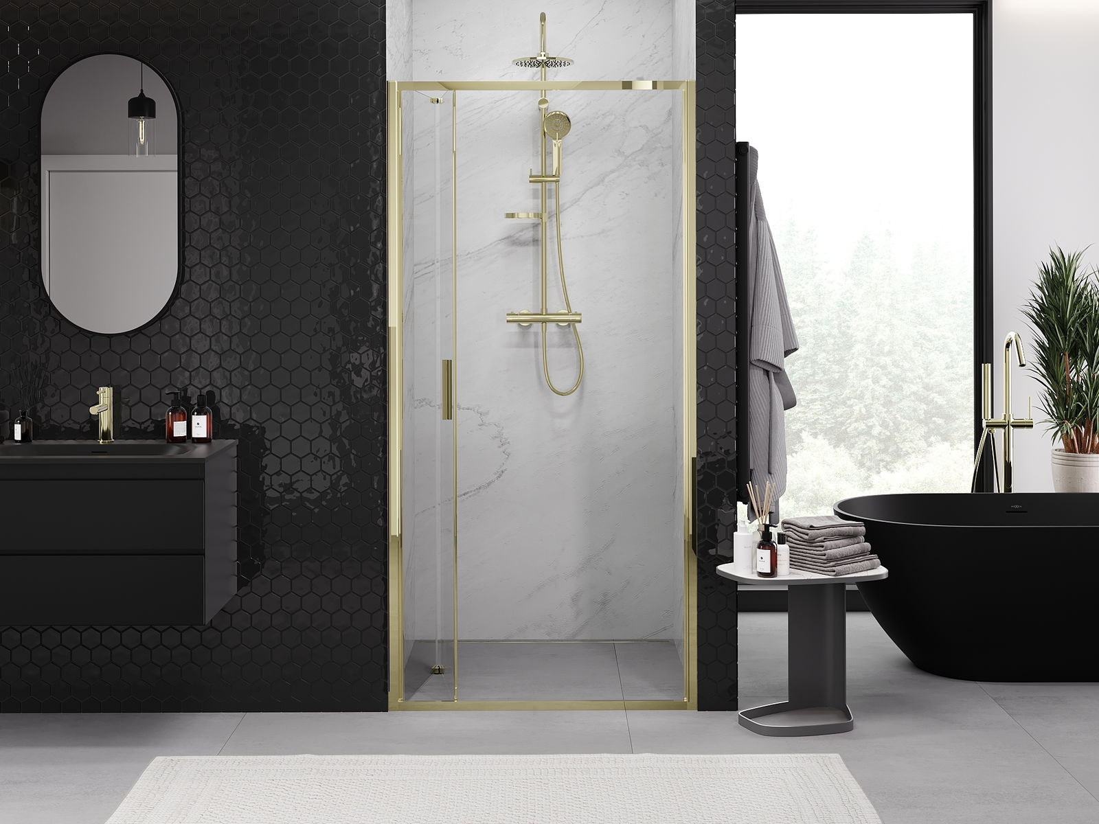 Praktická a pohodlná rukoväť je vyrobená z odolného a pevného kovu. Moderný tvar v kombinácii s povrchovou úpravou prispôsobenou farbe profilov dodáva celku moderný a štýlový vzhľad, zdôrazňujúc estetiku každej kúpeľne.