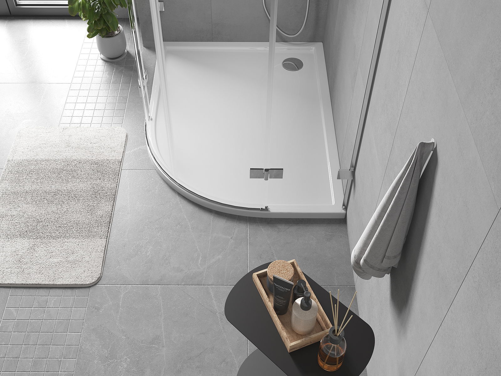 Sprchová vanička má nízky prah, čo uľahčuje vstupovanie a vystupovanie zo sprchy. Dodáva miestnosti výnimočný a nadčasový vzhľad, čím robí kúpeľňu komfortným a estetickým miestom na každodenný relax.