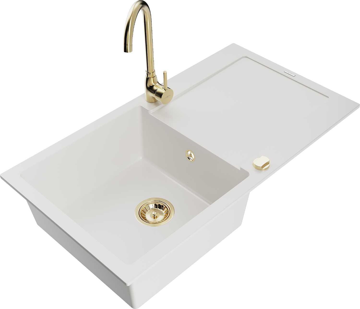 Mexen Leo granitový kuchynský drez s 1 komorou s odkvapkávačom a kuchynská batéria Telma, biela - 6501-20-670200-50