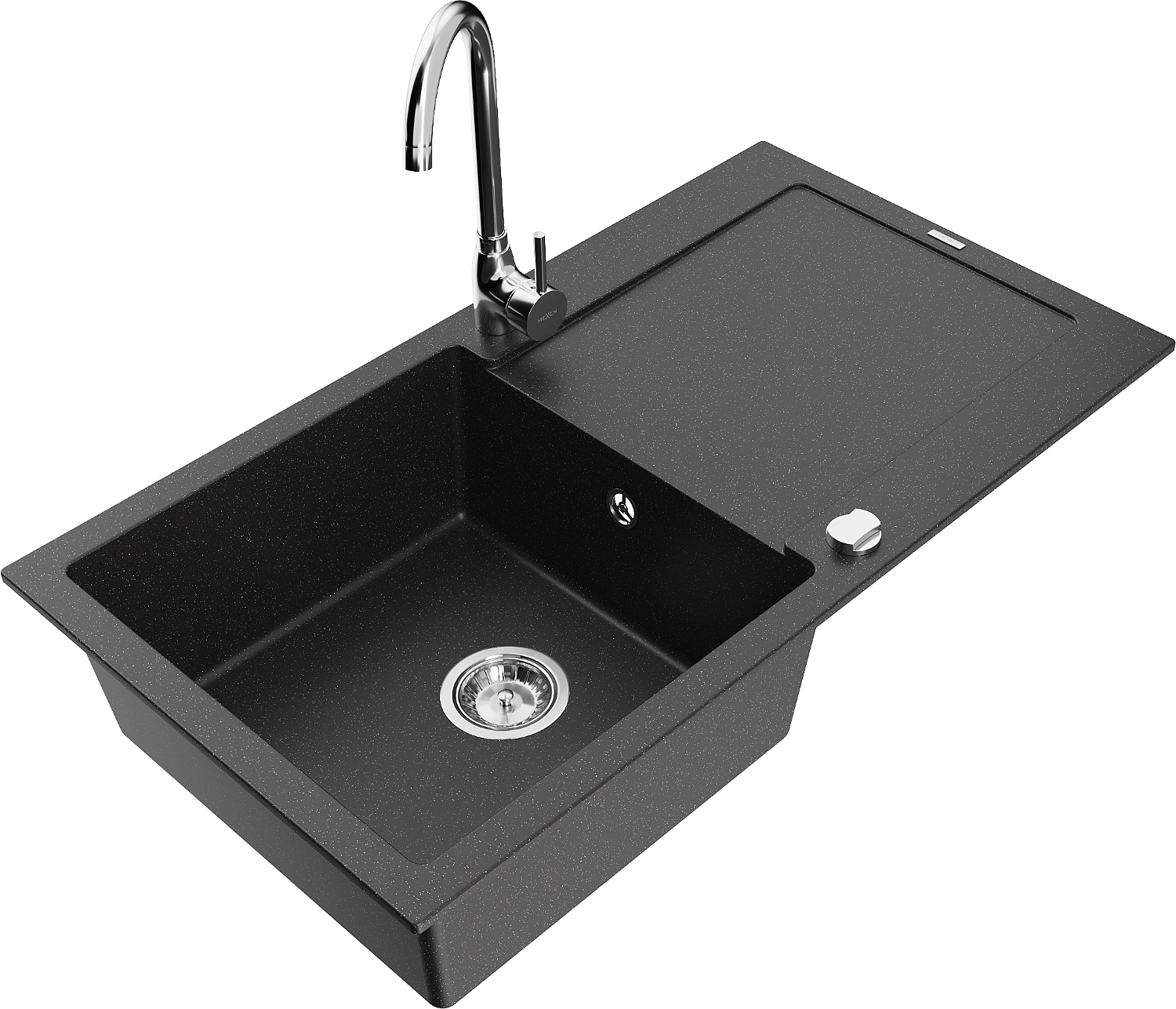 Mexen Leo granitový kuchynský drez s 1 komorou, odkvapkávačom a kuchynskou batériou Telma, čierny/strieborný metalický