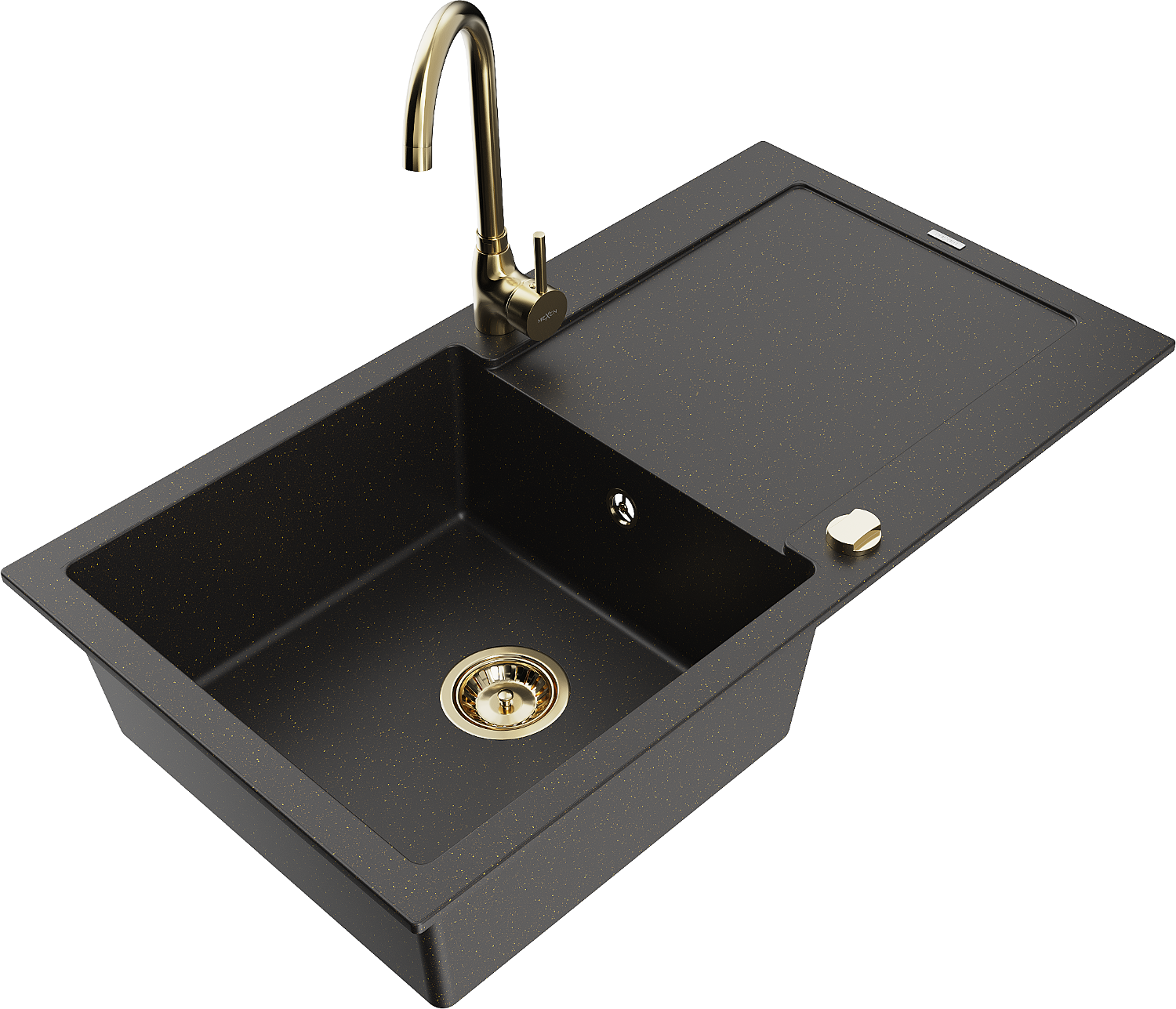 Mexen Leo žulový drez 1-komorový s odkvapkávačom a kuchynskou batériou Telma, čierny/zlatý metalik - 6501-75-670200-50