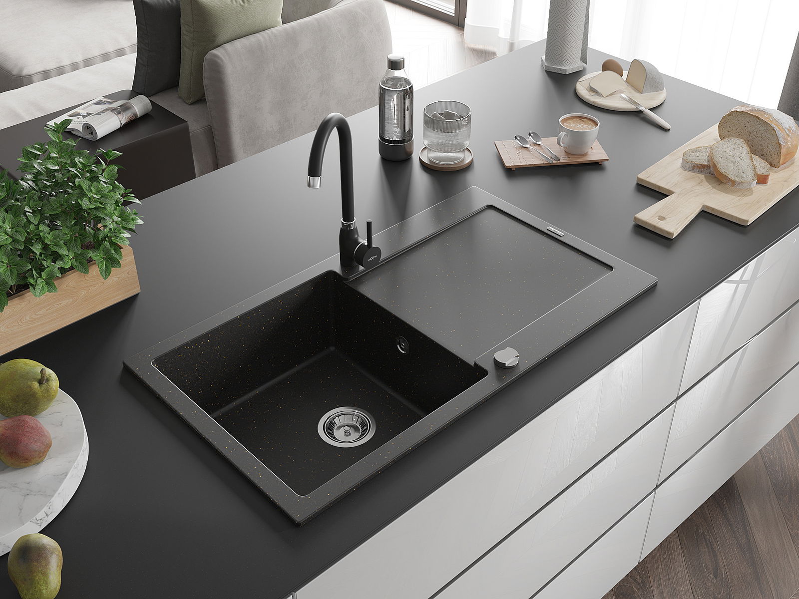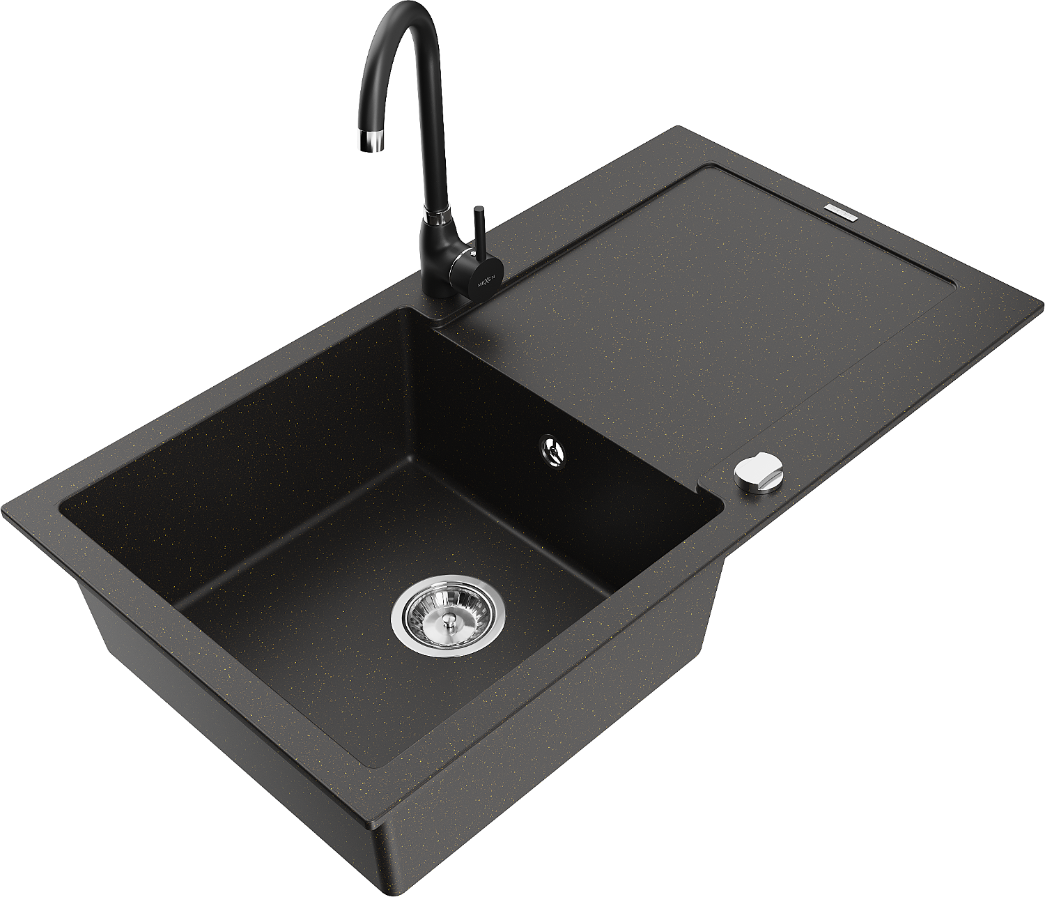 Mexen Leo granitový drez s jednou komorou a odkvapkávačom a kuchynskou batériou Telma, čierny/zlatý metalik