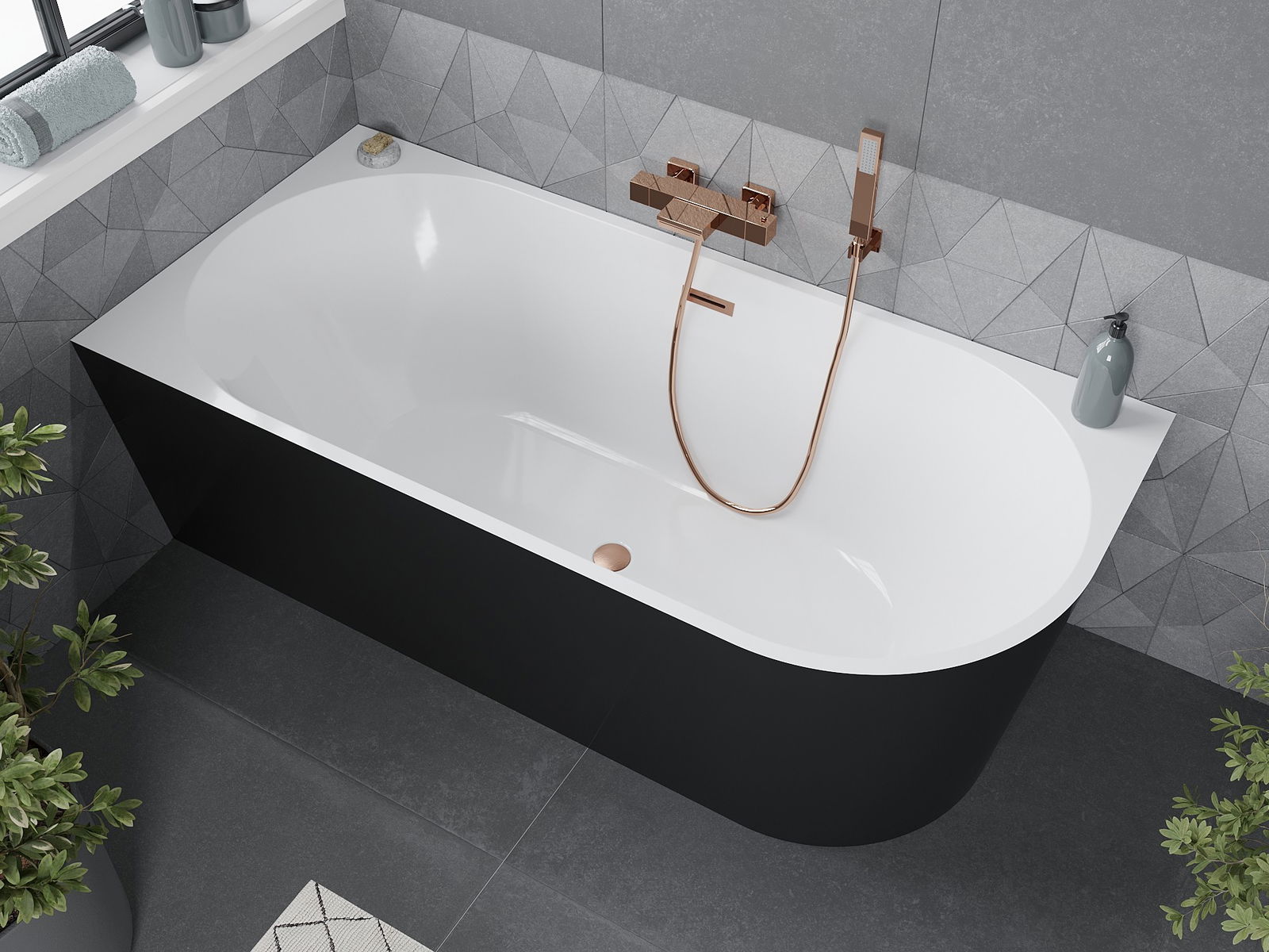 Mexen Mia voľne stojaca rohová vaňa ľavá 160 x 80 cm, biela/čierna, prepad kartáčovaná meď - 52691608075L-65