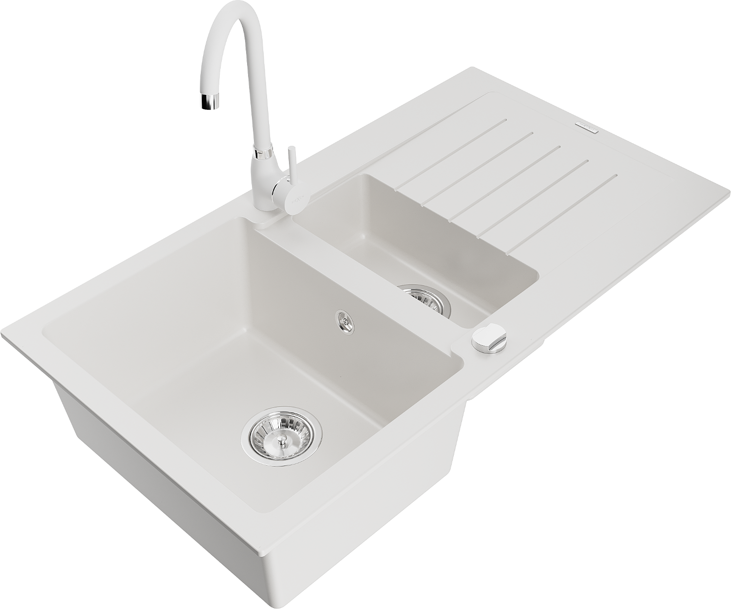 Mexen Matias granitový drez 1,5-komorový s odkvapkávacou plochou a kuchynskou batériou Telma, biely - 6502-20-670200-20