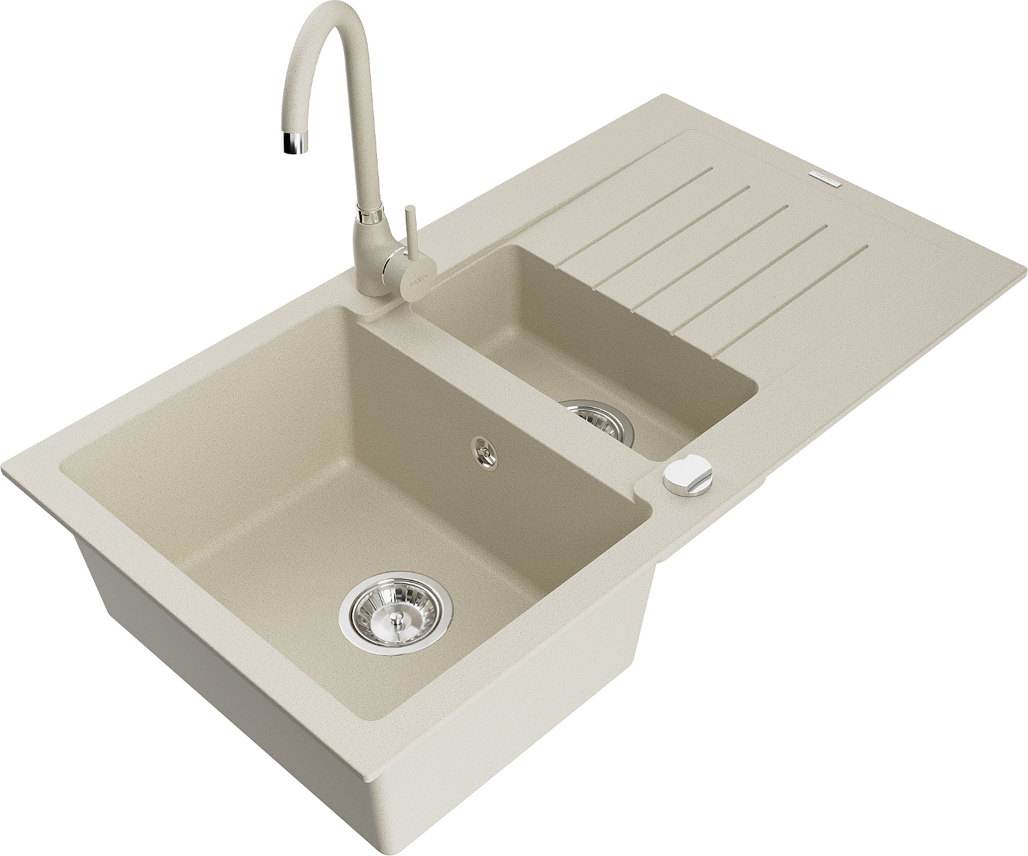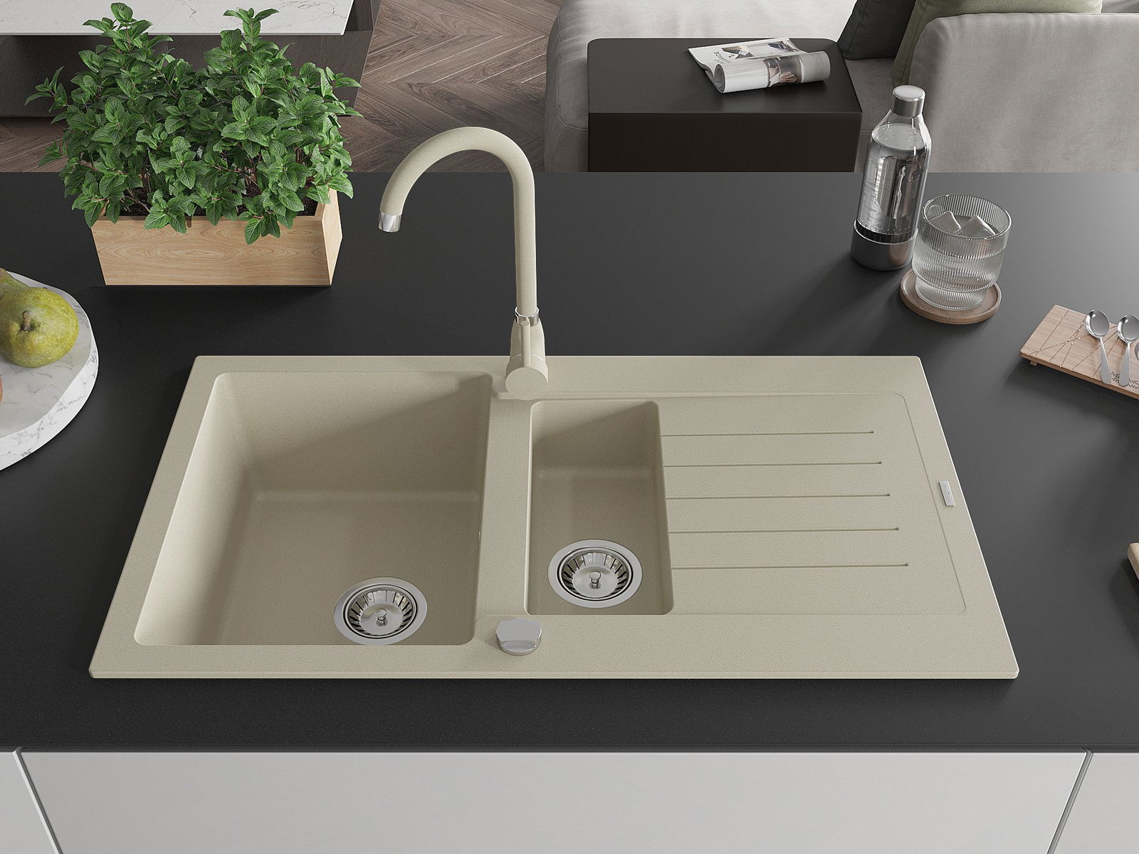 Mexen Matias žulový drez 1,5-komorový s odkvapkávačom a kuchynskou batériou Telma, béžový - 6502-69-670200-69