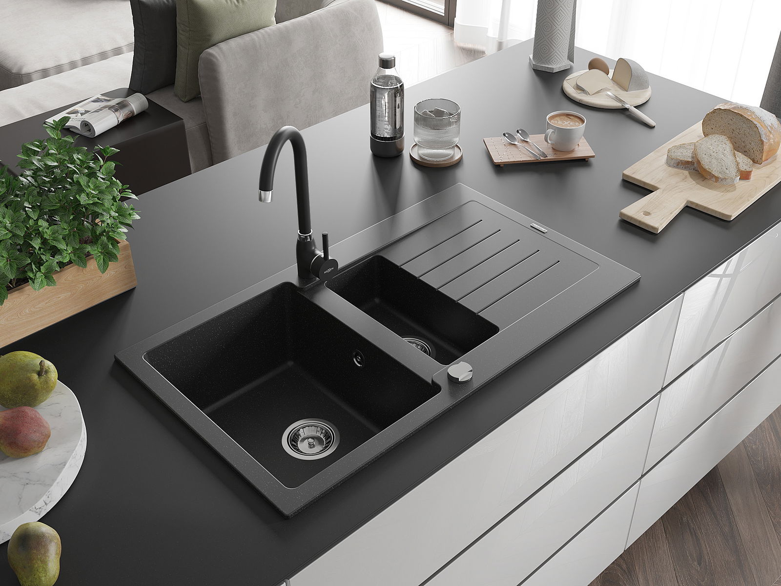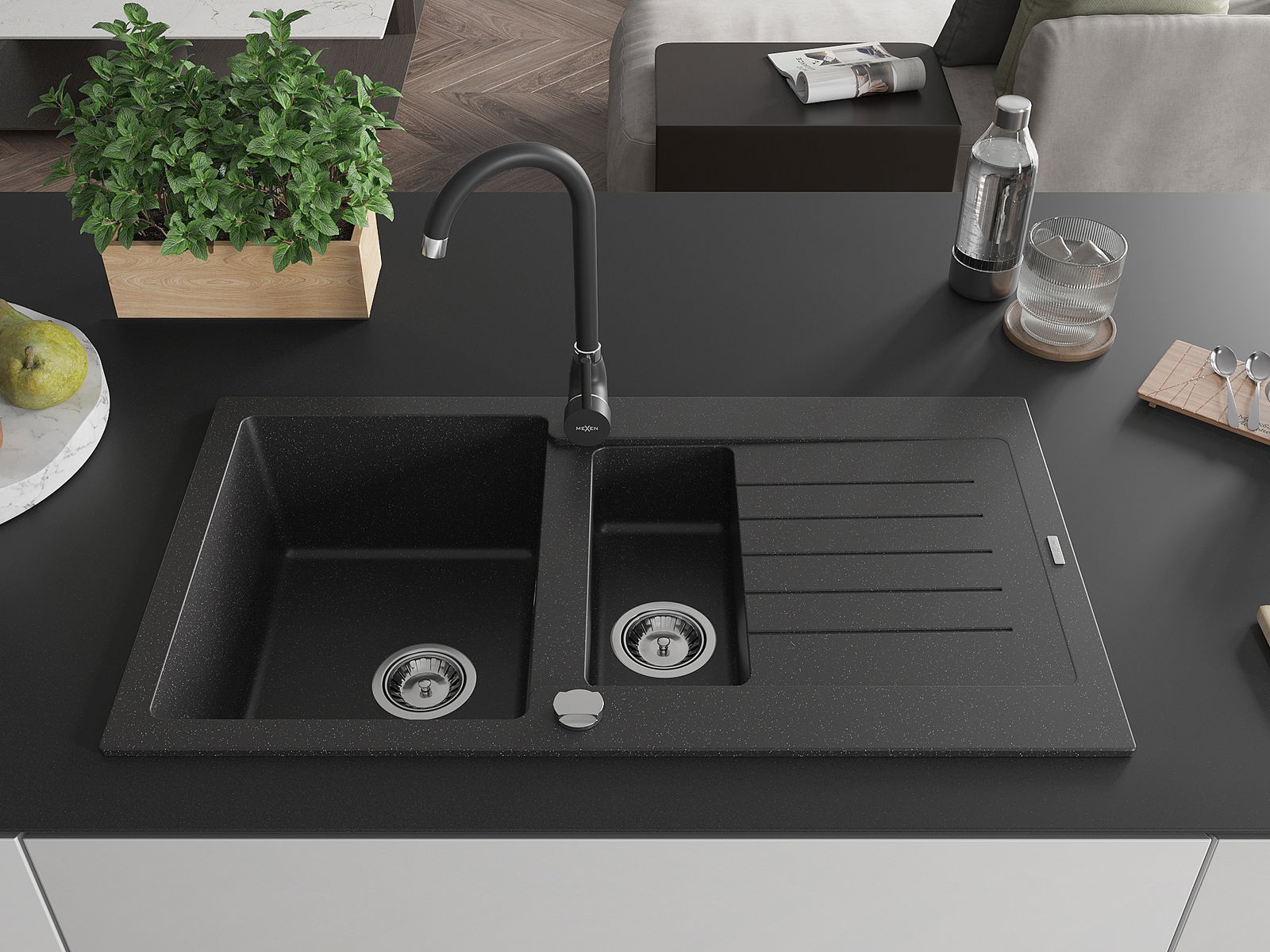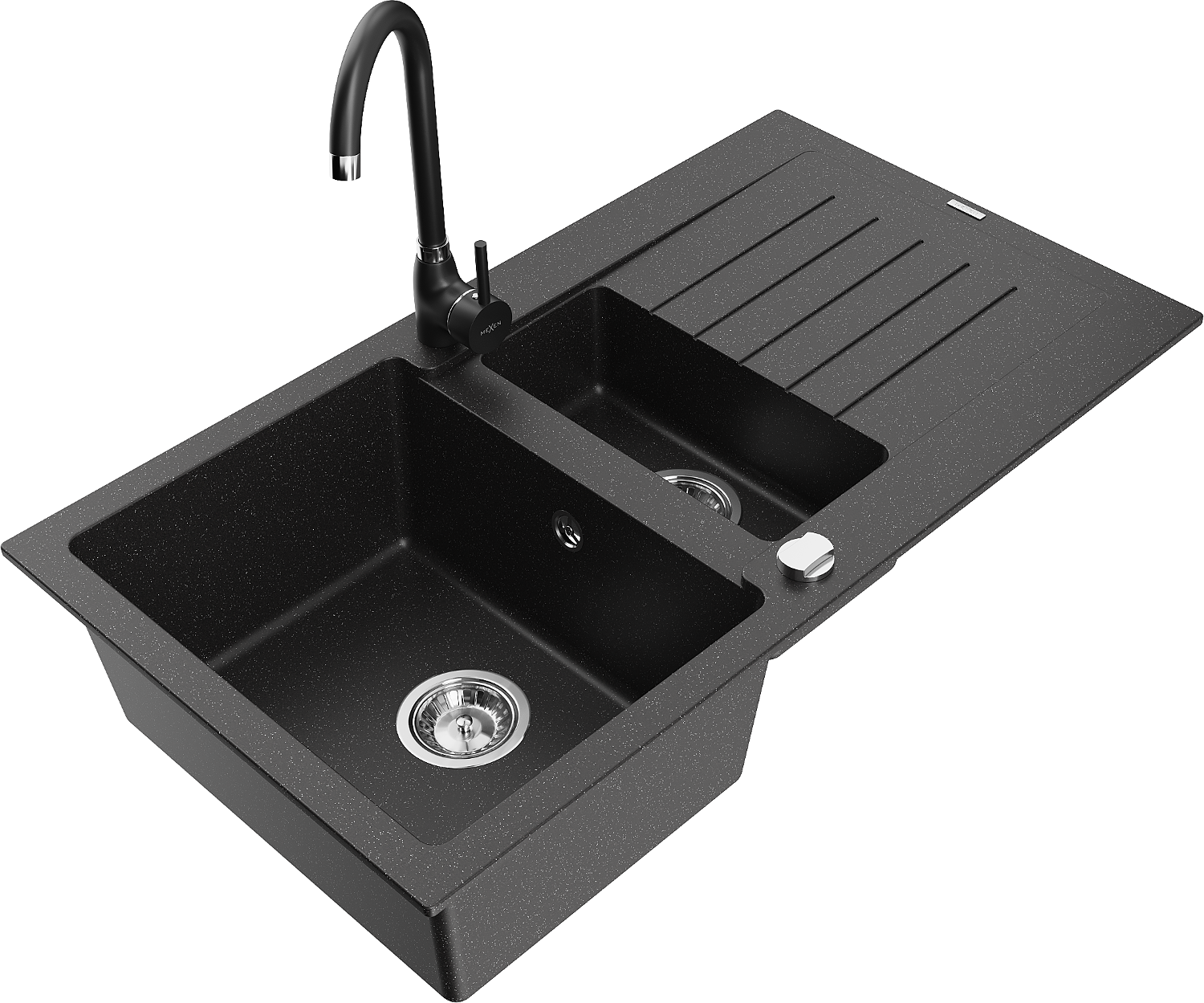 Mexen Matias granitový drez 1,5-komorový s odkvapkávačom a kuchynskou batériou Telma, čierny/strieborný