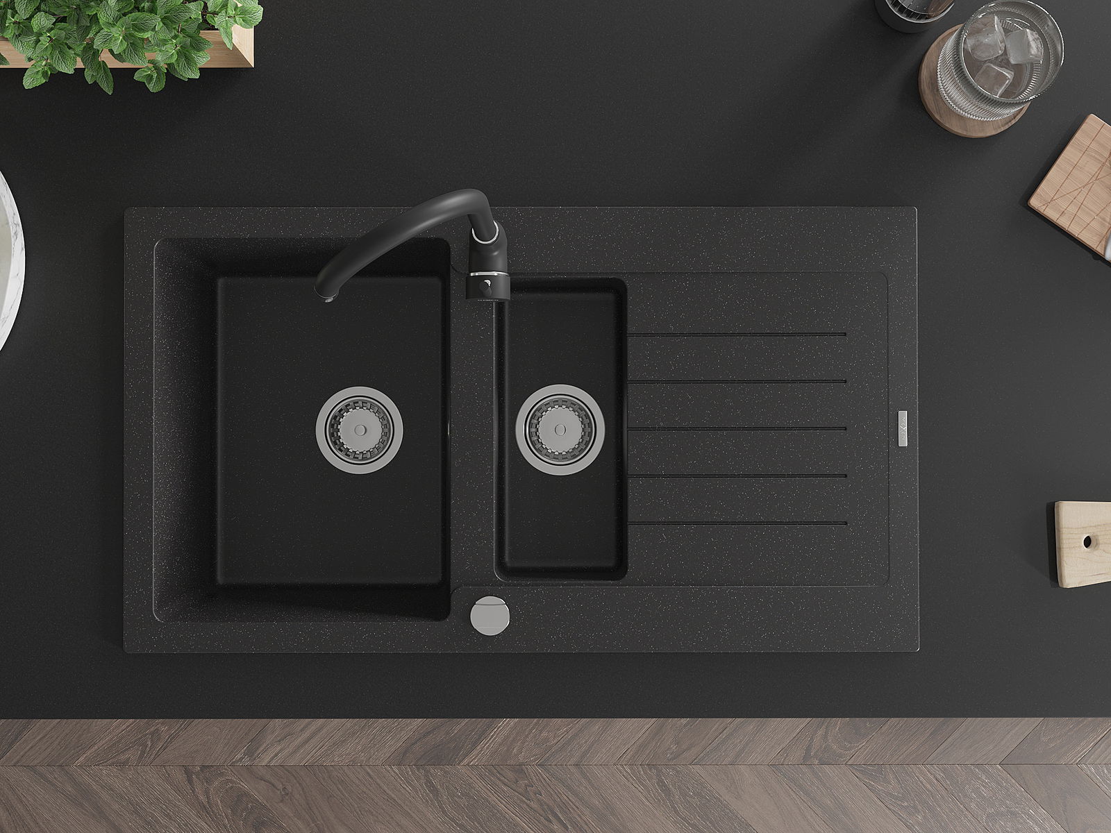 Povrch kuchynského drezu je odolný voči škvrnám a zafarbeniu, vďaka čomu sa ľahko udržiava a zachováva svoju farbu počas dlhého obdobia používania. Estetický a praktický doplnok pre každú kuchyňu.