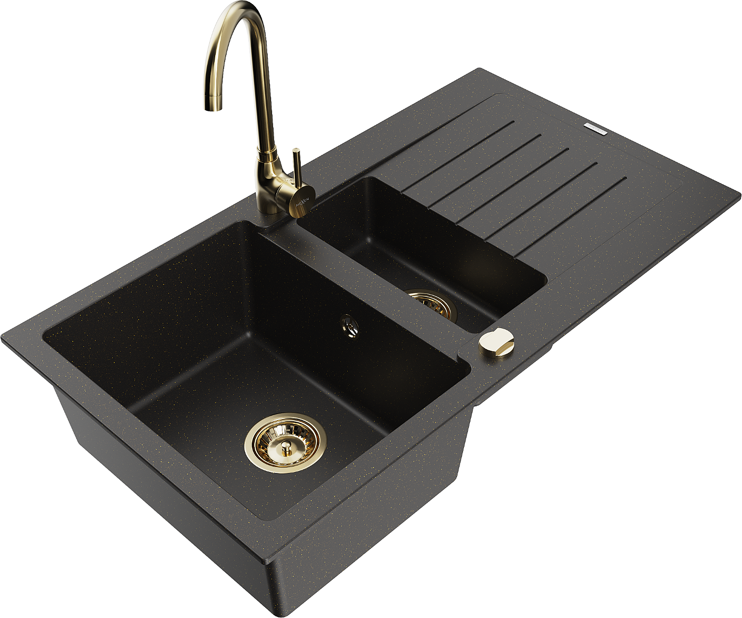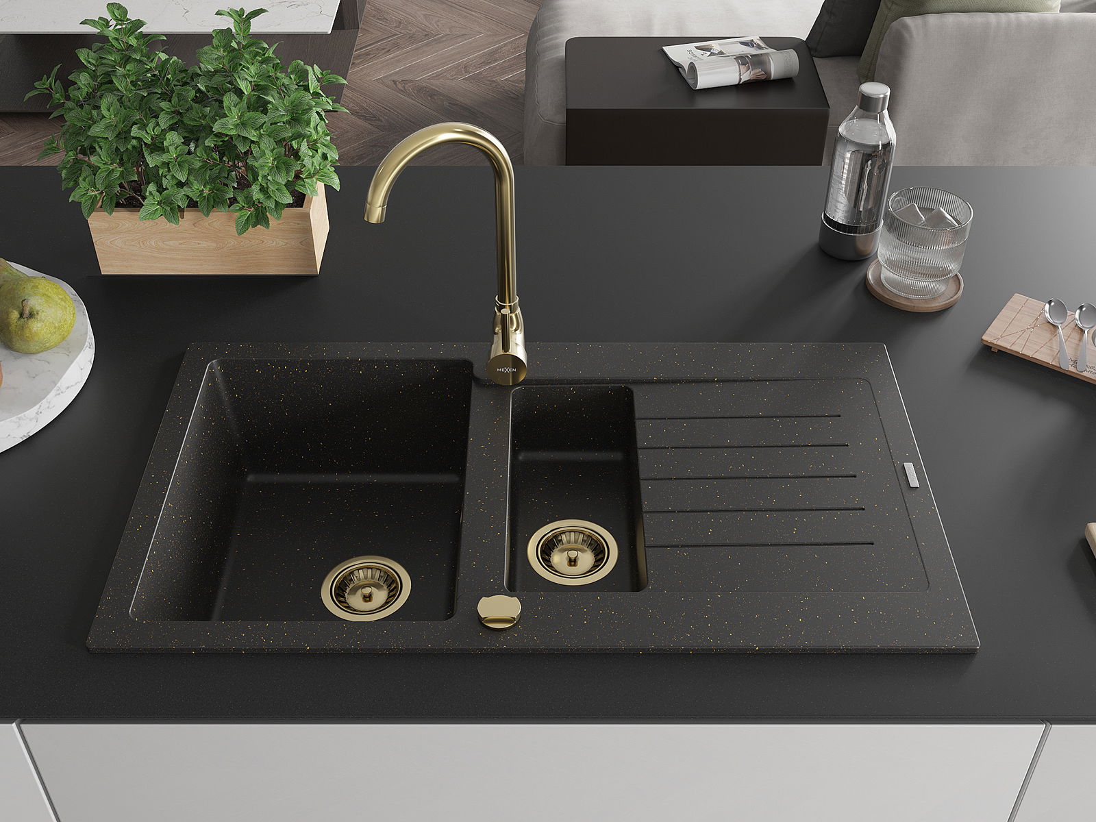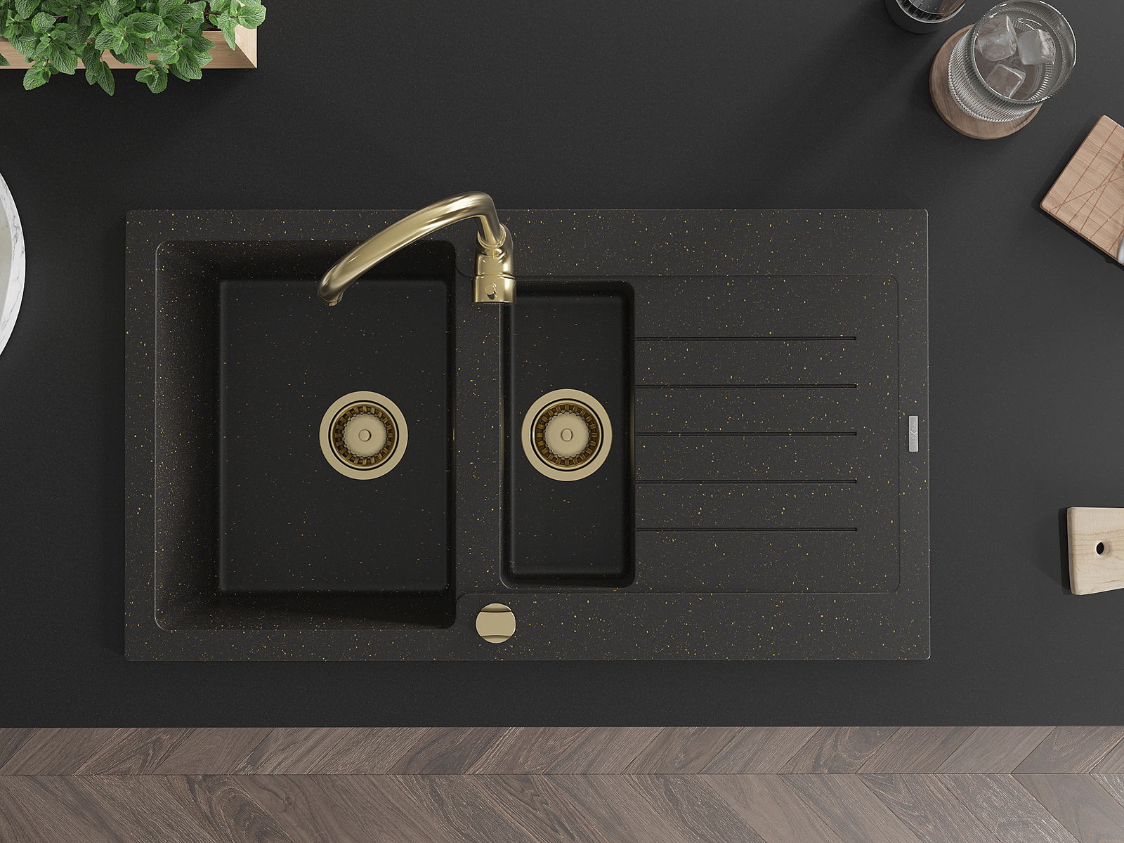 Mexen Matias granitový kuchynský drez s 1,5 komorou, odkvapkávač a kuchynská batéria Telma, čierna/zlatá - 6502-75-670200-50
