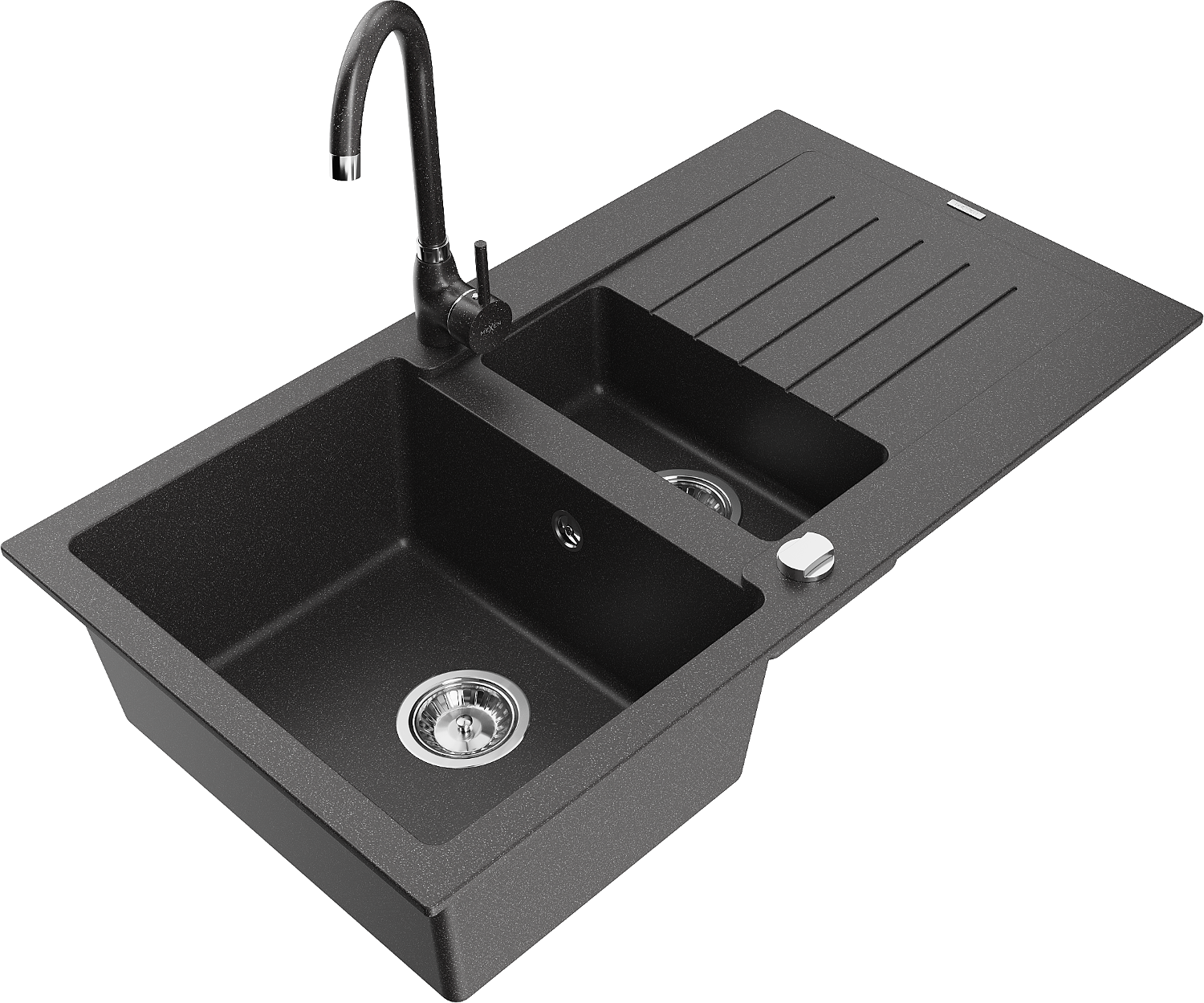 Mexen Matias granitový drez 1,5-komorový s odkvapkávačom a kuchynskou batériou Telma, čierny bodkovaný - 6502-76-670200-76