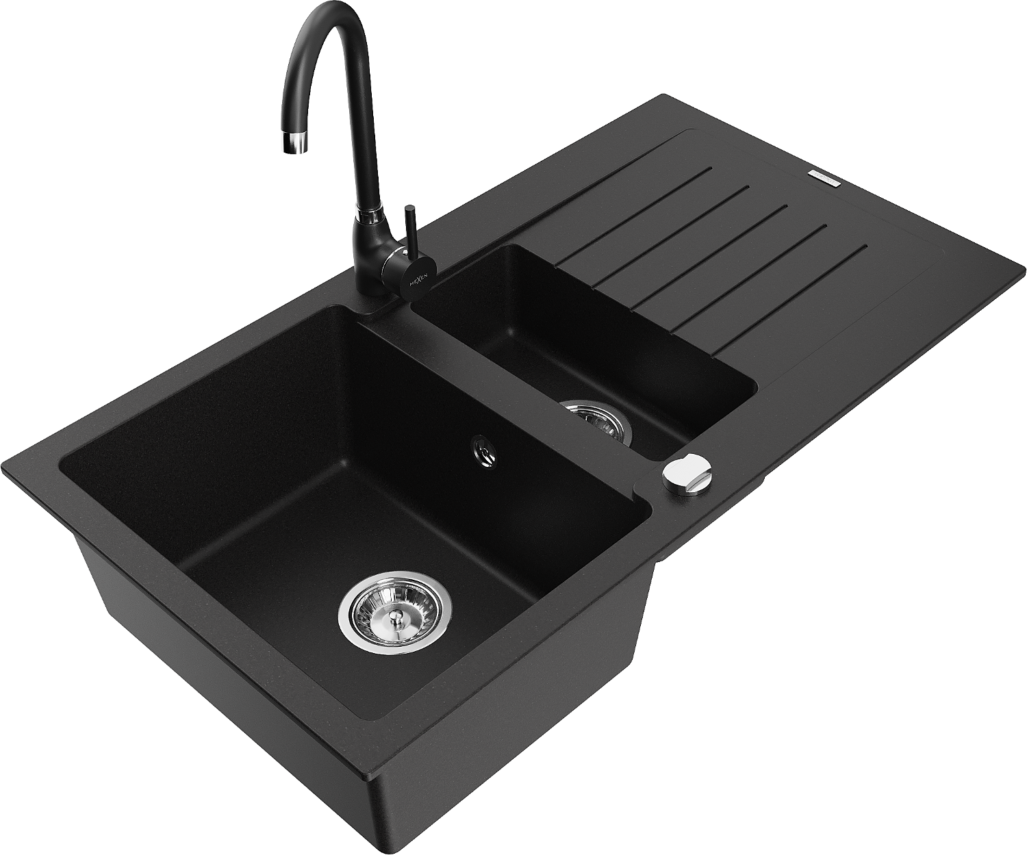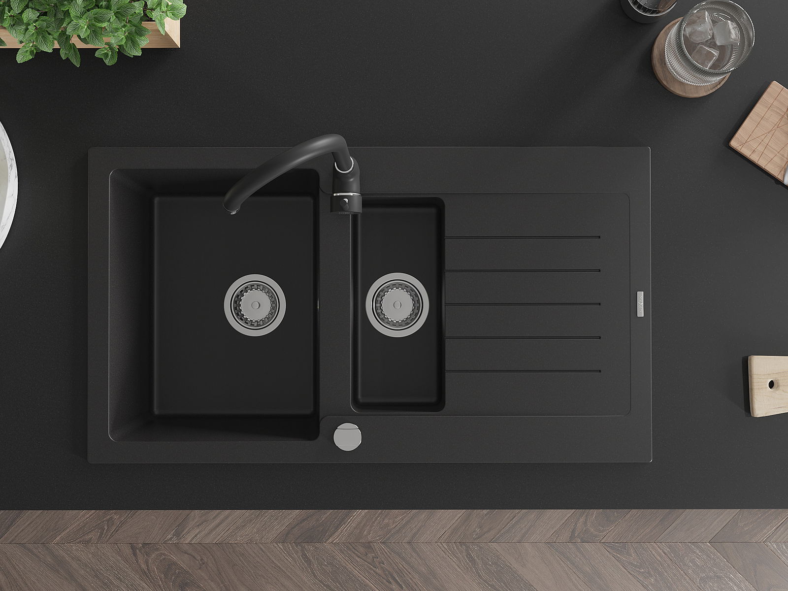 Mexen Matias granitový drez 1,5-komorový s odkvapkávačom a kuchynskou batériou Telma, čierny - 6502-77-670200-70
