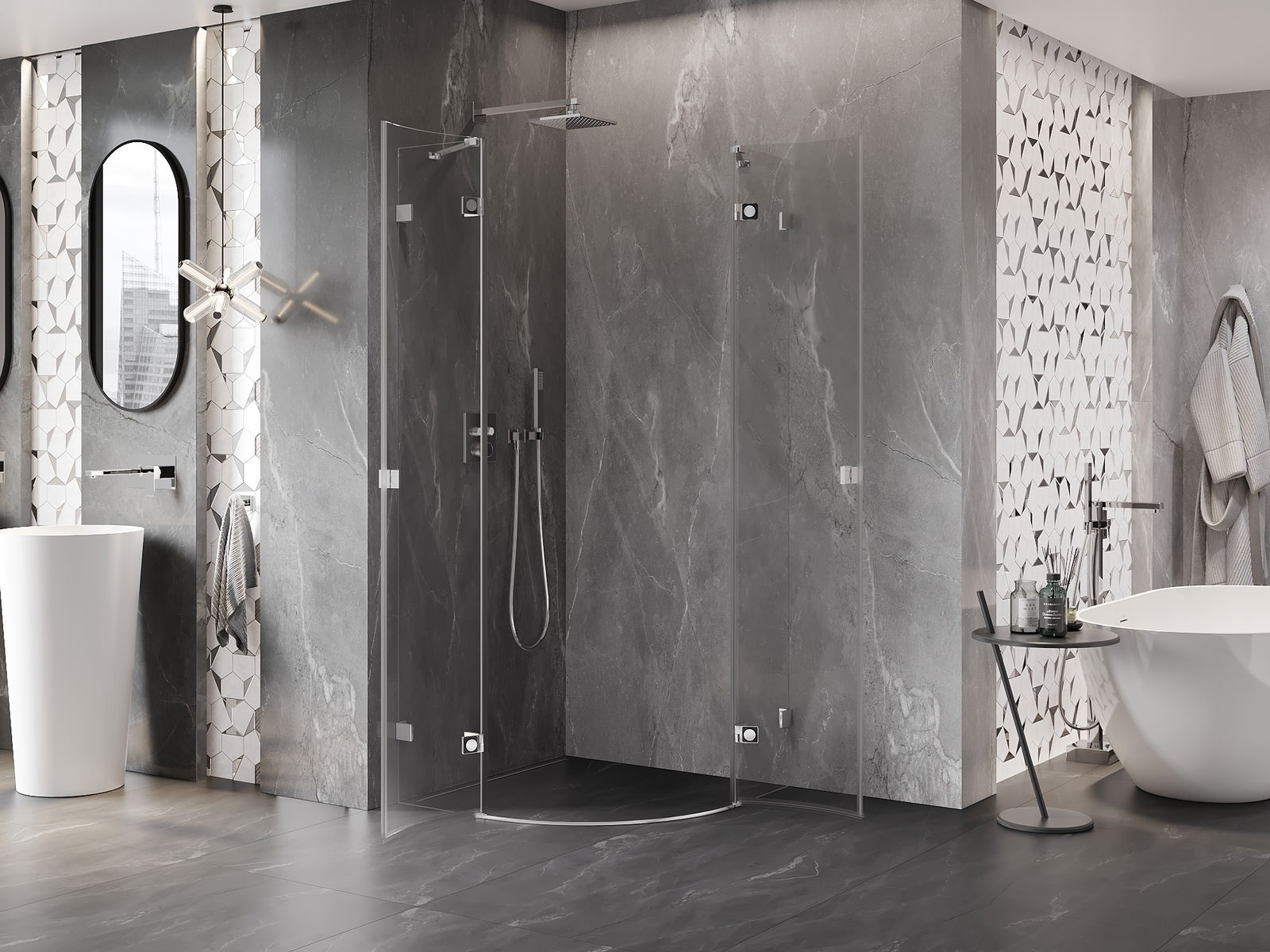 Praktická a pohodlná rukoväť je vyrobená z odolného a pevného kovu. Moderný tvar v kombinácii s povrchovou úpravou prispôsobenou farbe profilov dodáva celku moderný a štýlový vzhľad, zdôrazňujúc estetiku každej kúpeľne.