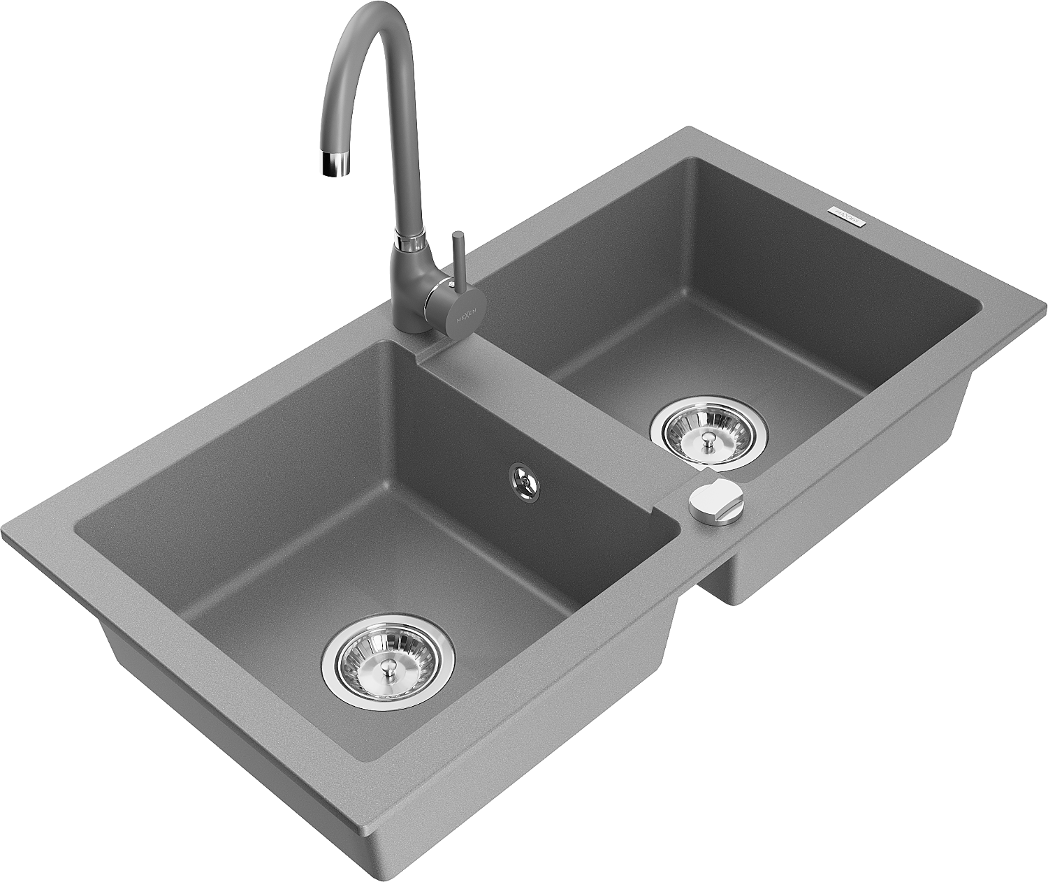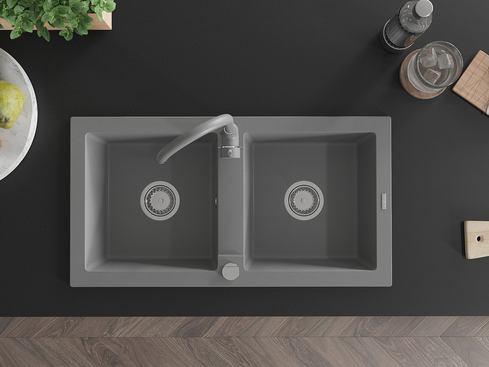 Mexen Mario žulový kuchynský drez s 2 komorami a kuchynskou batériou Telma, sivý - 6504-71-670200-71