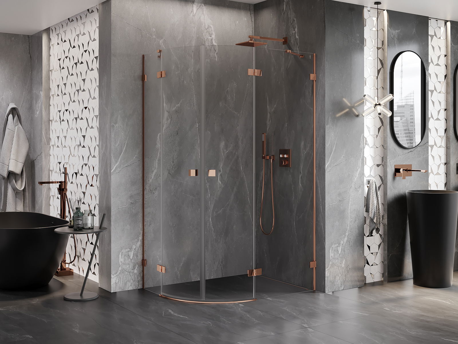 Praktická a pohodlná rukoväť je vyrobená z odolného a pevného kovu. Moderný tvar v kombinácii s povrchovou úpravou prispôsobenou farbe profilov dodáva celku moderný a štýlový vzhľad, zdôrazňujúc estetiku každej kúpeľne.