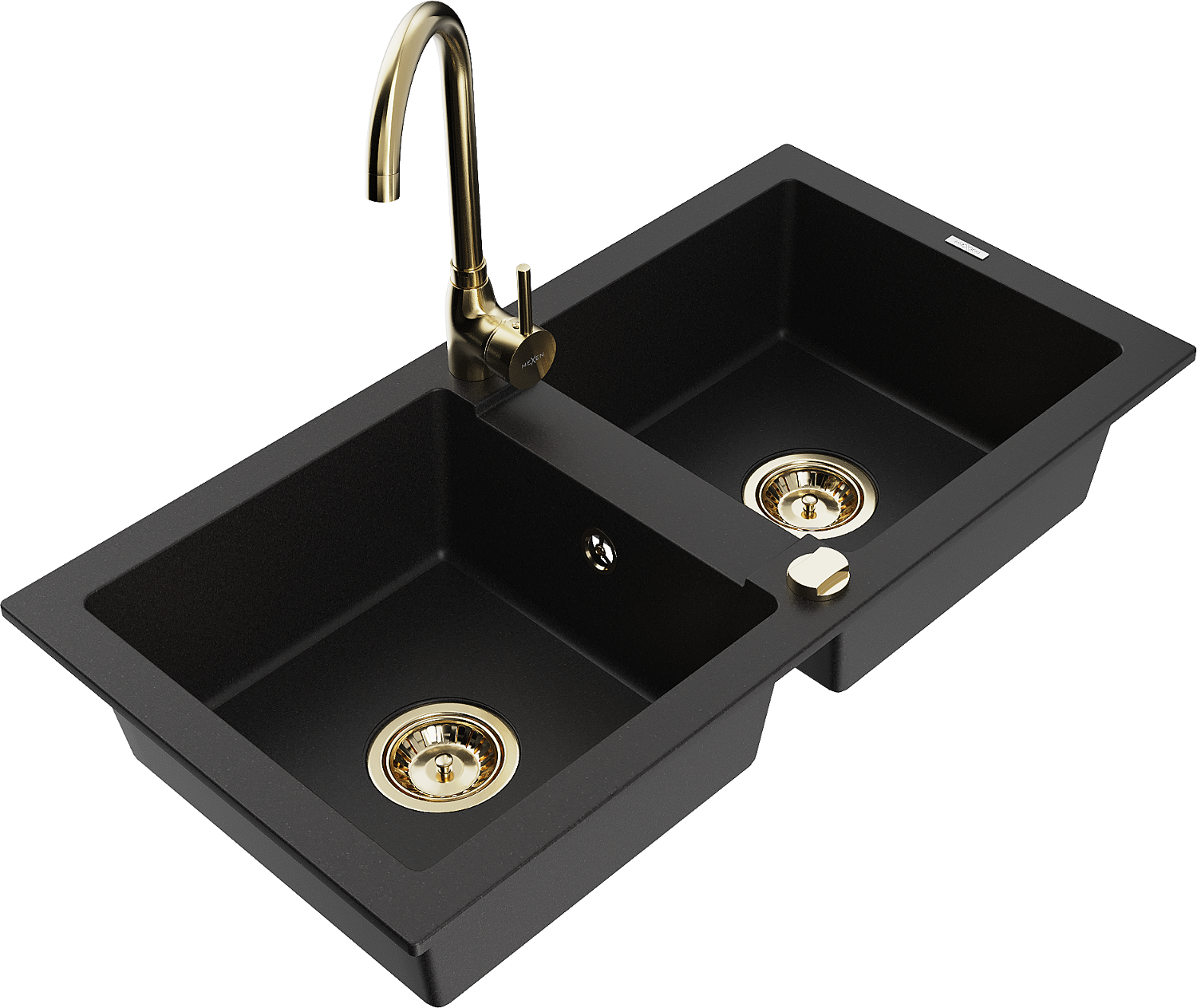 Mexen Mario granitový kuchynský drez 2-komorový s kuchynskou batériou Telma, čierny - 6504-77-670200-50