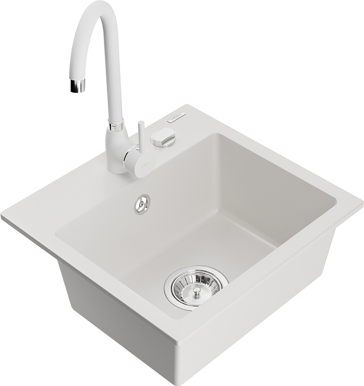 Mexen Milo kuchynský drez z granitu 1-komorový s kuchynskou batériou Telma, biely - 6505-20-670200-20