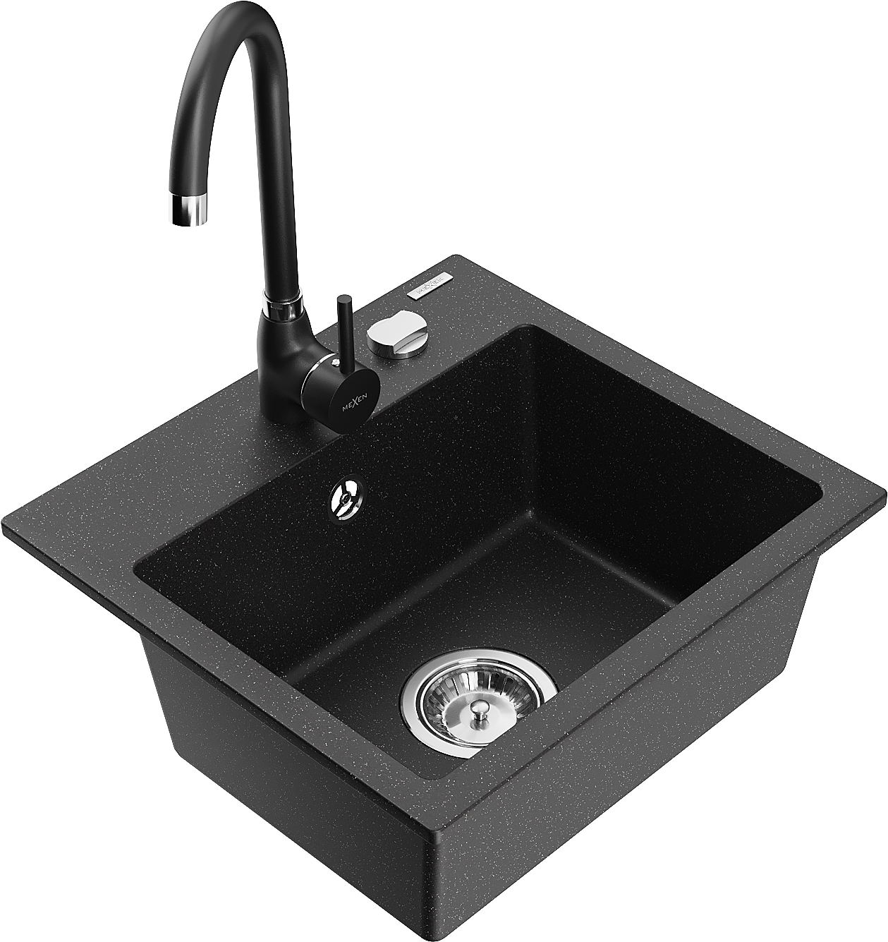 Mexen Milo žulový drez 1-komorový s kuchynskou batériou Telma, čierny/strieborný - 6505-73-670200-70