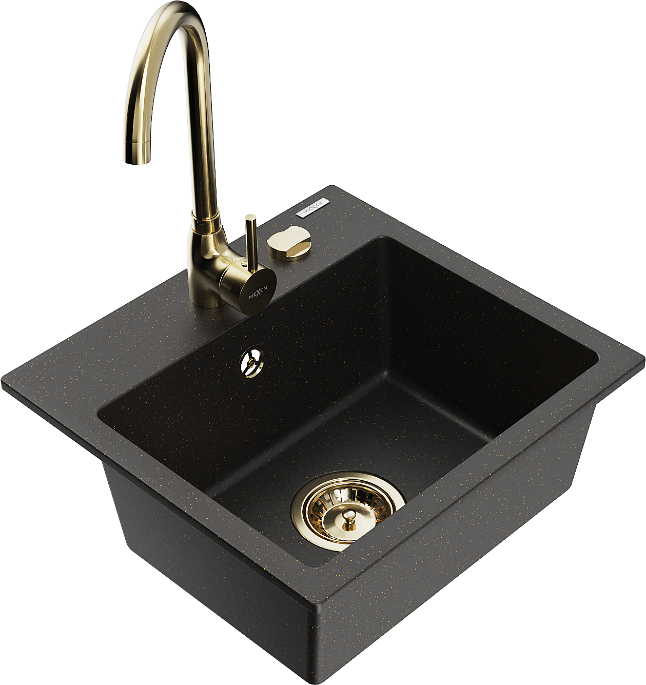 Mexen Milo granitový drez 1-komorový s kuchynskou batériou Telma, čierny/zlatý - 6505-75-670200-50