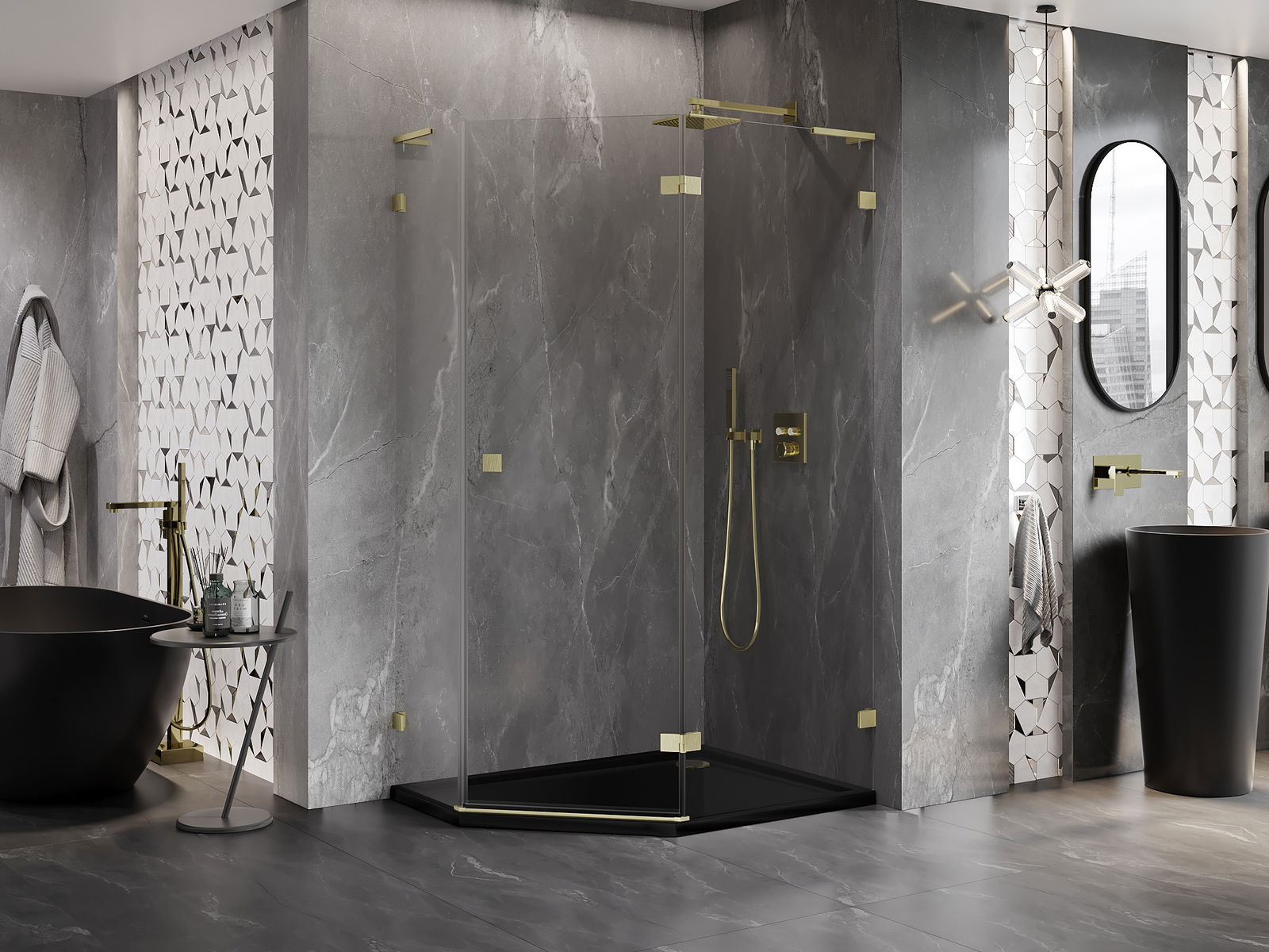 Mexen Lunar L päťuholníková sprchová kabína otočná pravá 90 x 80 cm, priehľadná, zlatá kartáčovaná - 831L-090P-080L-55-00-P